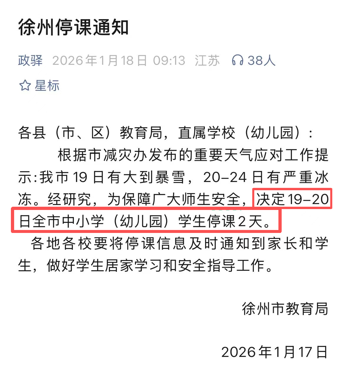今天早上,徐州市教育局发布通知,根据市减灾办发布的重要天气应对工作提示:我市19日有大到暴雪,20-24日有严重冰冻。经研究,为保障广大师生安全,决定19-20日全市中小学(幼儿园)学生停课2天。