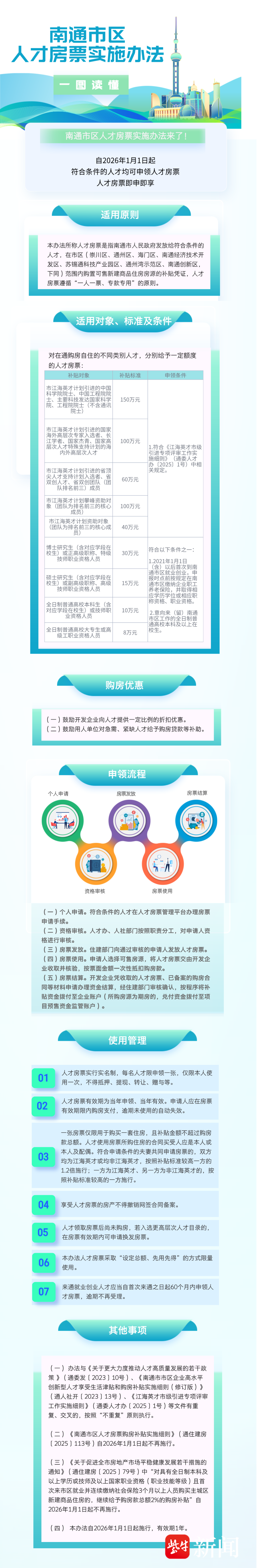 南通市发布的《南通市区人才房票实施办法》明确,符合条件的人才(含应届毕业生)在该市区购买新建商品住房时,可直接使用“人才房票”抵扣房款,补贴额度最高可达150万元。