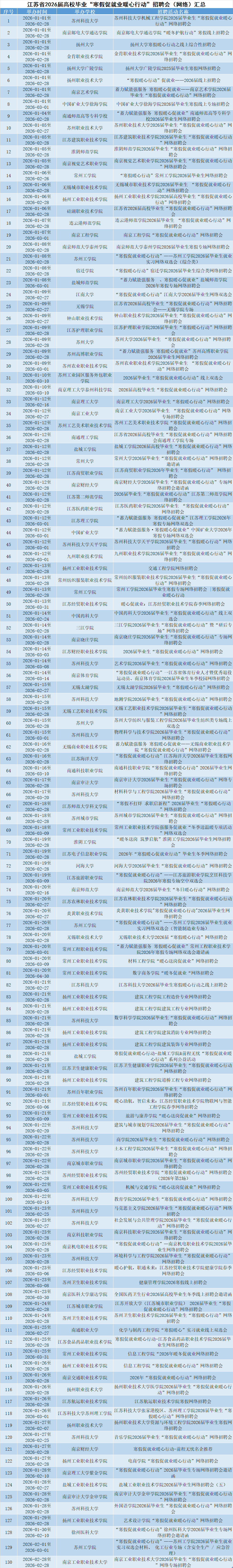 为促进高校毕业生就业,这个寒假,教育部组织开展2026届高校毕业生“寒假促就业暖心行动”。记者了解到,“江苏24365大学生就业服务平台”集中推出了系列“寒假促就业暖心行动”网络招聘会专场,助力毕业生在寒假期间顺利求职。
