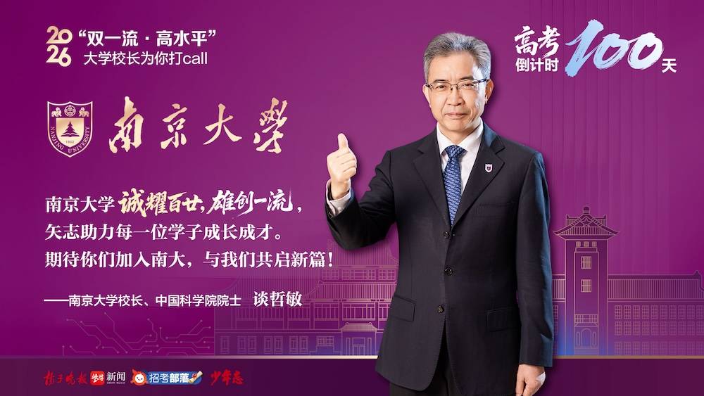 “此刻的你们,正站在青春的关键路口,以梦为马,蓄势待发。在这个特别的日子里,我向逐光而行的你们致以最美好的祝福!”2月27日,高三学子迎来高考倒计时100天。扬子晚报2026“双一流·高水平大学校长为你打call”系列正式推出。南京大学校长、中国科学院院士谈哲敏送上祝福,他表示,南京大学诚耀百廿、雄创一流,始终秉持“办中国最好本科教育”的初心,坚持“以学生发展为中心”的理念,矢志助力每一位学子成长成才。