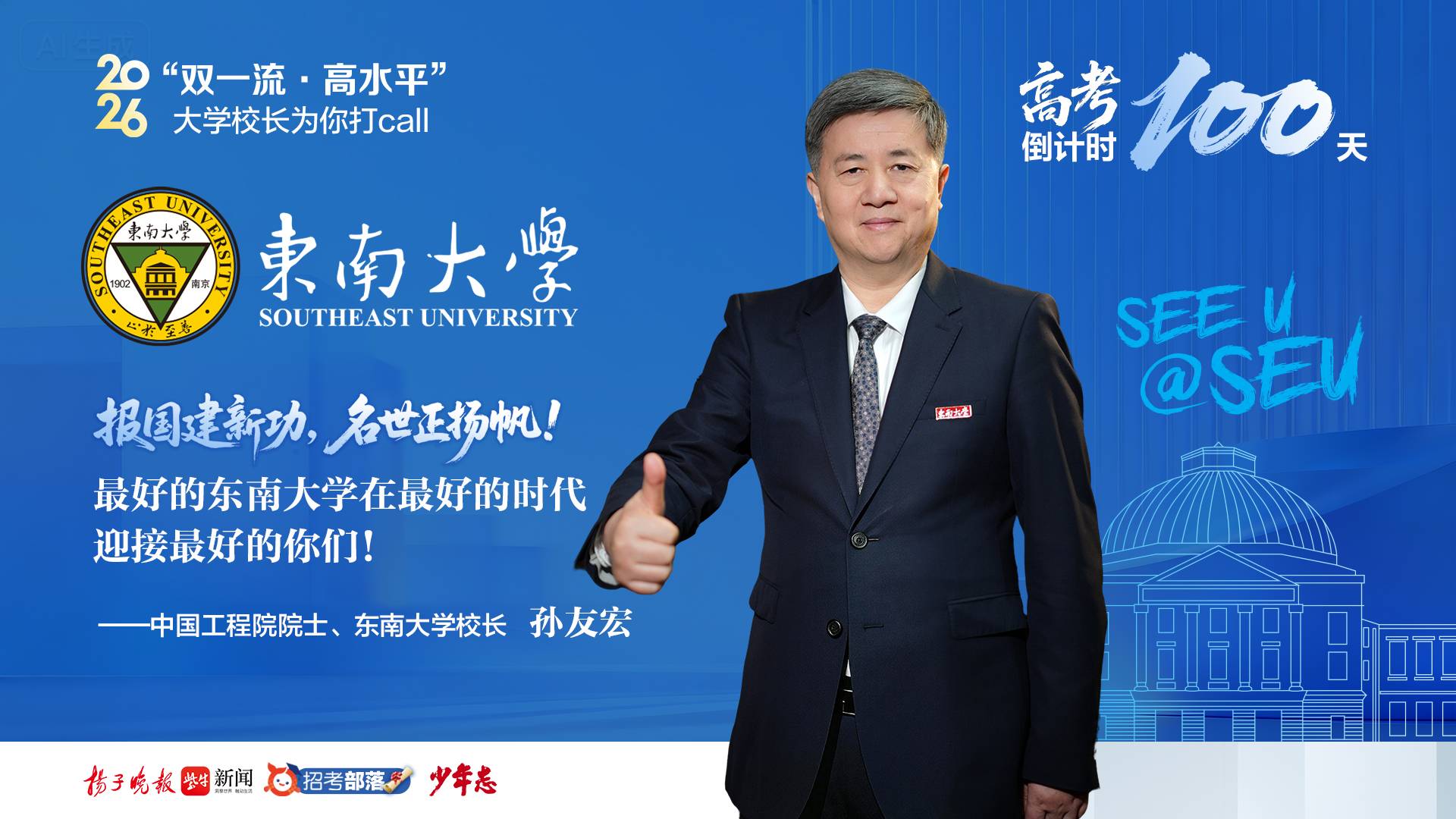 2月27日,高三学子迎来高考百天倒计时。扬子晚报招考部落联动少年志融媒平台,推出2026“双一流·高水平大学校长为你打call”系列宣传,邀请双一流·高水平大学的校长出镜,为高考生送上祝福。中国工程院院士、东南大学校长孙友宏向全国考生发出诚挚邀约:“最好的东南大学在最好的时代迎接最好的你们!”