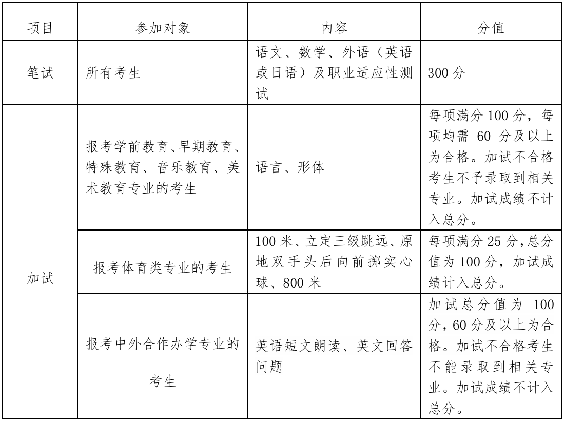 普通类(非师范)专业:总成绩 = 合格考折算成绩 + 笔试成绩 + 政策加分。(中外合作办学专业需加试合格)