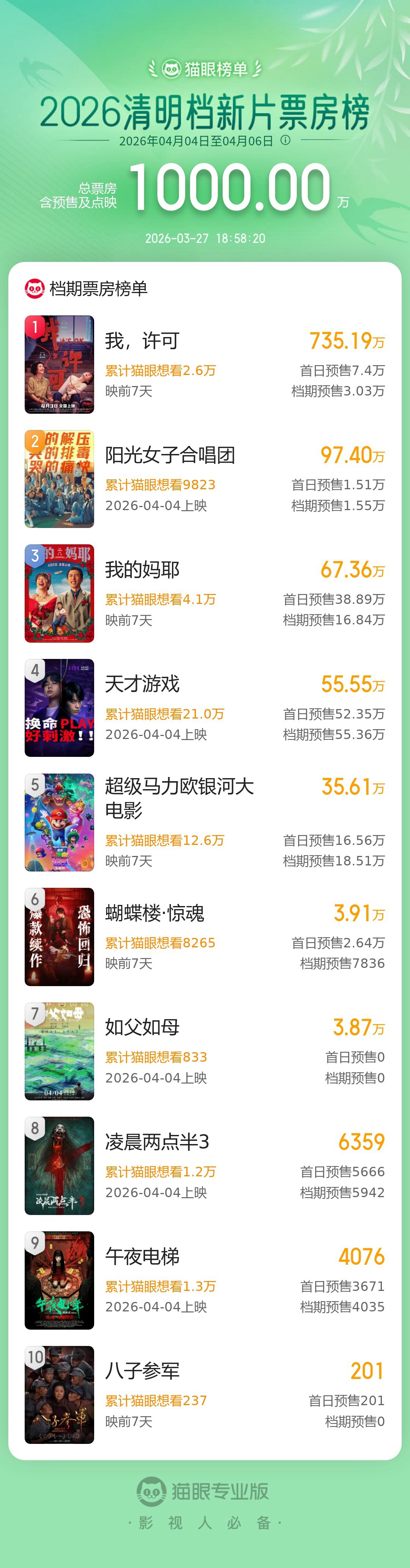据猫眼专业版数据,截至3月27日18时58分,2026年清明档新片预售总票房破1000万,《我,许可》《阳光女子合唱团》《我的妈耶》暂列清明档新片预售票房榜前三位。