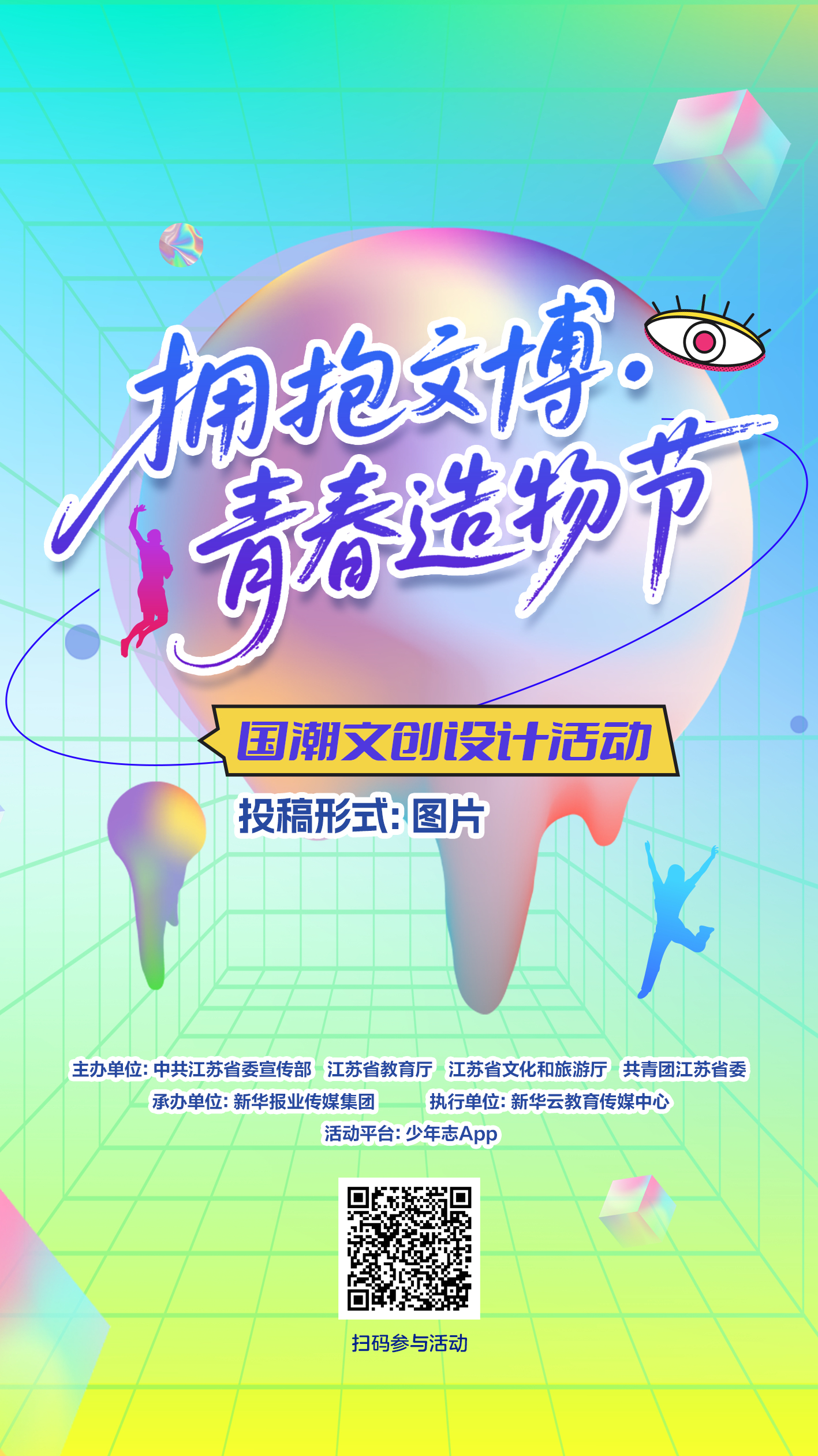 水韵江苏文脉绵长,千年文博瑰宝熠熠生辉。为推动博物馆馆藏资源融入现代生活,让传统文化与青春创意碰撞交融,由江苏省委宣传部、省教育厅、省文化和旅游厅、团省委联合主办,新华报业传媒集团承办 的2026年“拥抱文博”江苏青少年文化实践行动特别推出“拥抱文博·青春造物节”国潮文创设计活动,面向全省大中小学生征集优秀文创设计作品,邀请青少年化身“文博推广主理人”,用创意设计让江苏文脉焕发新生。