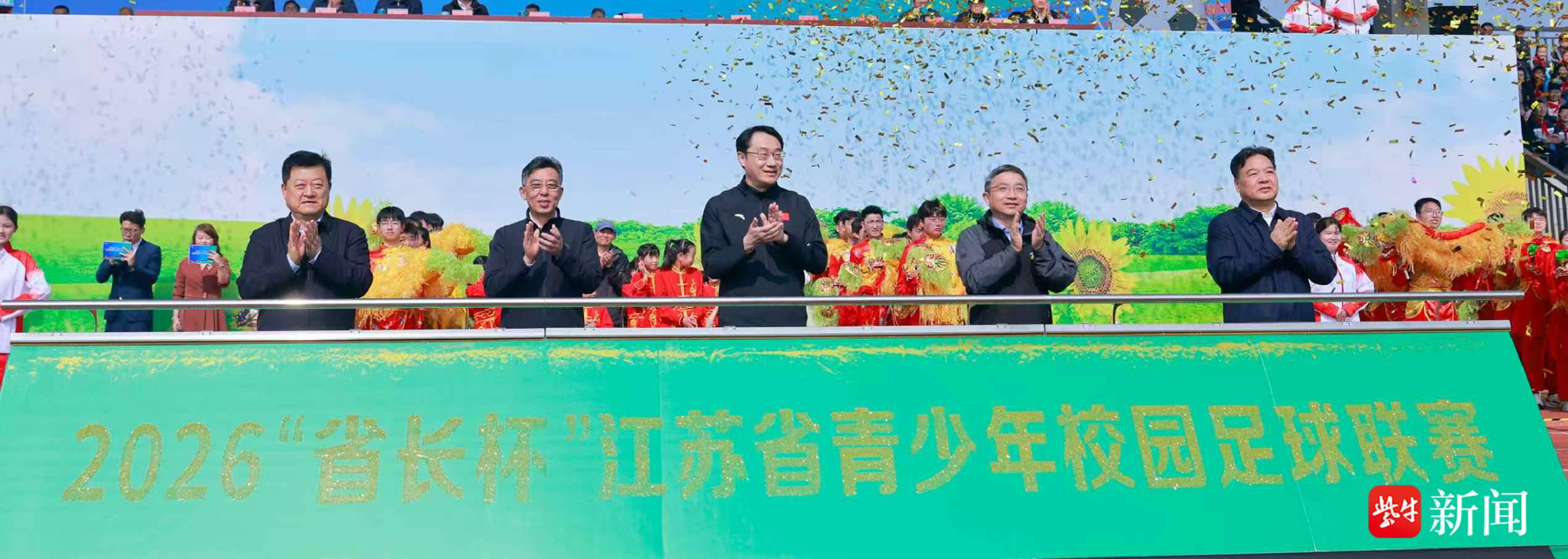 副省长赵岩,省教育厅厅长、省委教育工委书记江涌,省体育局局长陈少军,南京市委常委、江北新区党工委书记、浦口区委书记陆卫东,南京市副市长孙百军等共同推杆,正式宣布2026“省长杯”江苏省青少年校园足球联赛开幕。