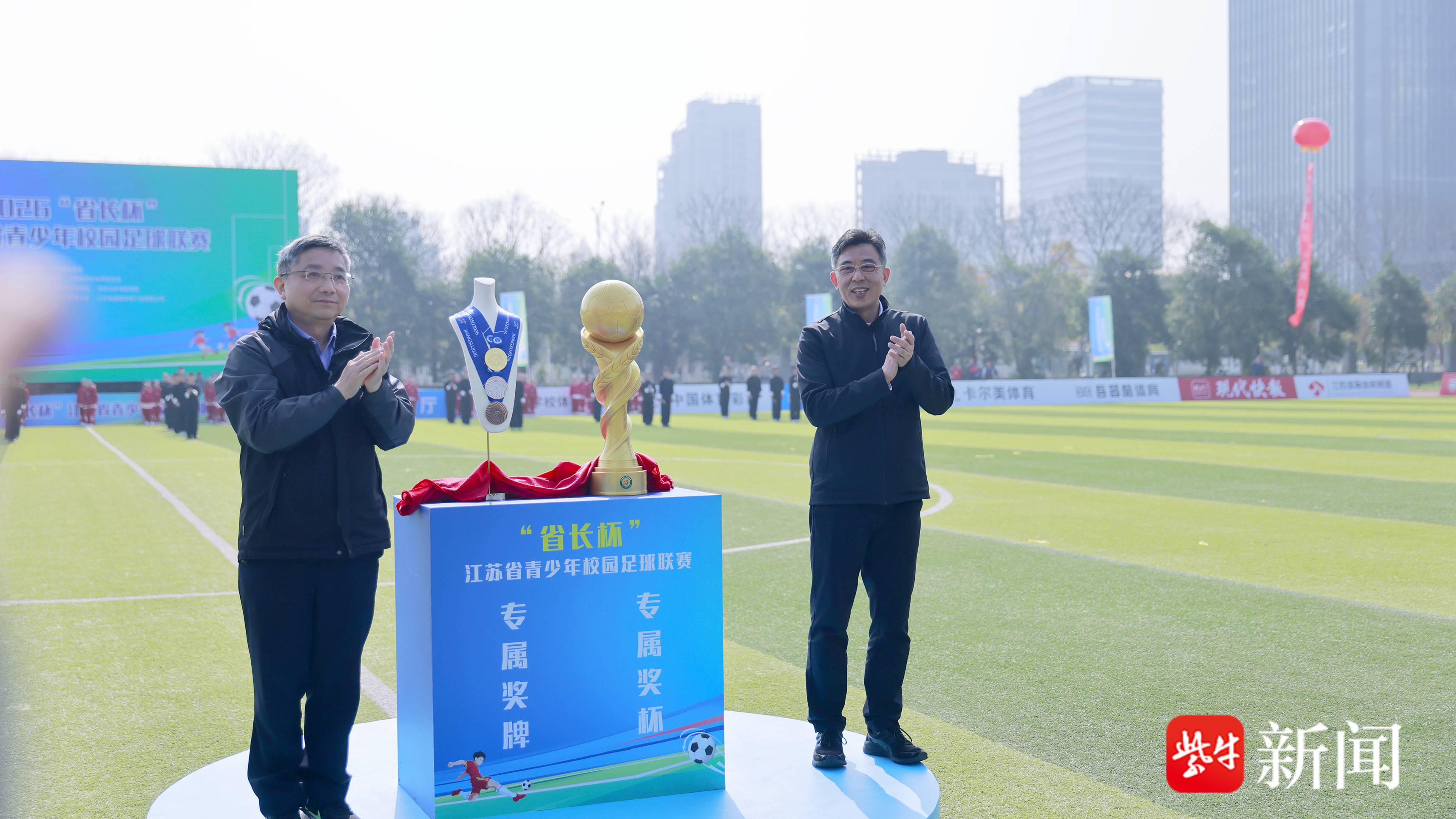 值得关注的是,2026“省长杯”迎来全新里程碑,省教育厅厅长、省委教育工委书记江涌,省体育局局长陈少军共同为全新设计的“省长杯”联赛奖杯、奖牌揭幕。奖杯定名“共创”,融合江苏水文化与校园足球育人理念,以水韵为基、桃李为脉、新芽为势、足球为冠,象征团结拼搏、共创共赢;奖牌定名“水韵”,水波纹样寓意江苏各地青少年的拼搏汗水凝结荣耀,绶带饰以云锦水样暗纹,尽显传统与现代融合的江苏韵味。全新奖杯奖牌的亮相,也让江苏省青少年校园足球荣誉体系进一步丰满完善。