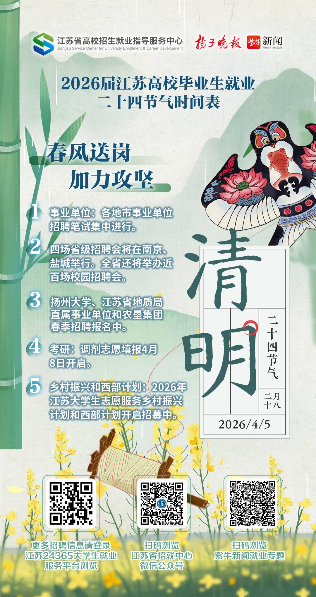 4月5日,我们迎来了二十四节气中的清明。江苏省高校招生就业指导服务中心与扬子晚报继续推出“2026届江苏高校毕业生就业二十四节气时间表”,就毕业生关心的就业核心主题与相关行动,按照二十四节气的时间节点做出重要事项提醒,让毕业生就业更有方向。