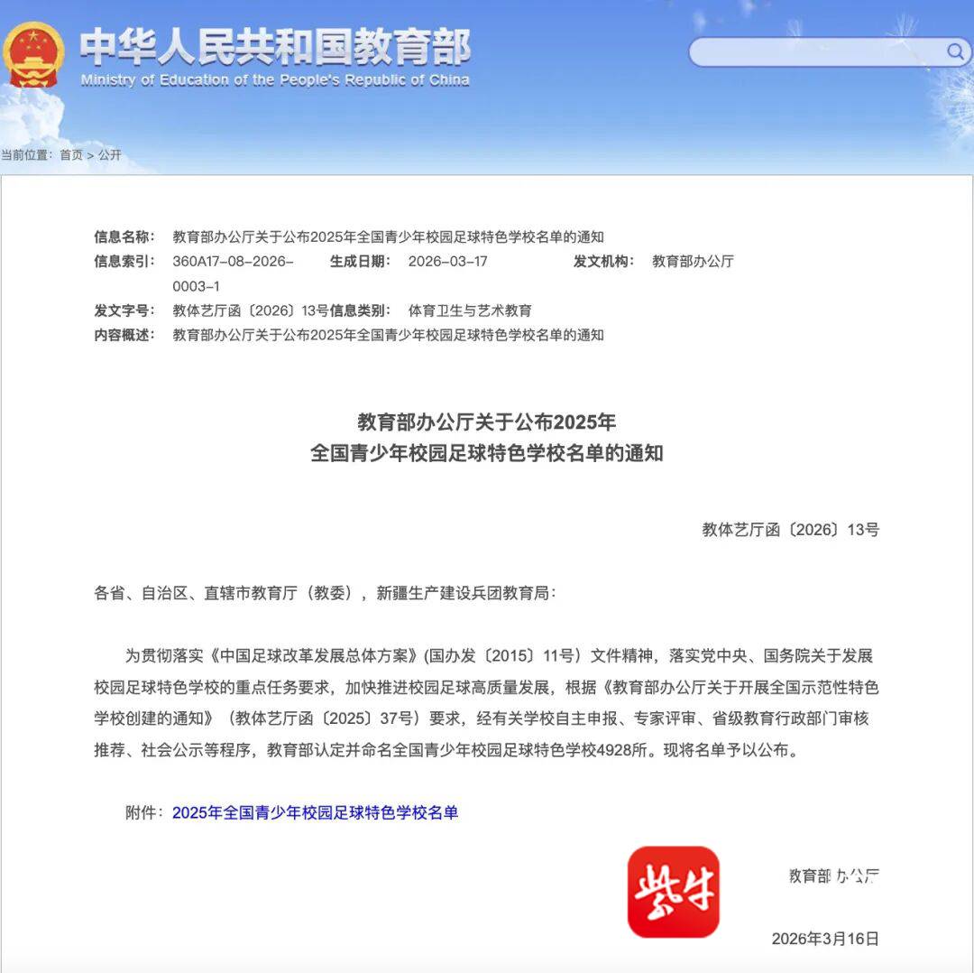 近日,教育部办公厅印发《关于公布2025年全国青少年校园足球特色学校名单的通知》(教体艺厅函〔2026〕13号)。教育部认定并命名全国青少年校园足球特色学校4928所。