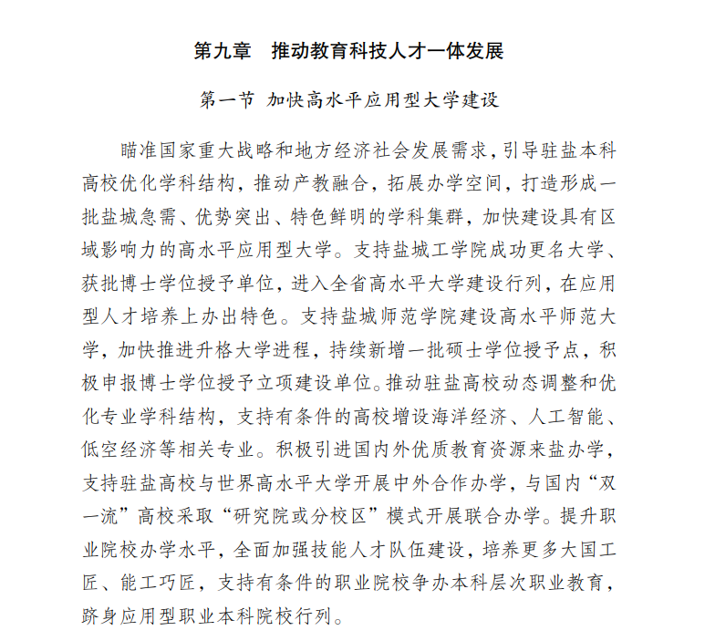 其中提到瞄准国家重大战略和地方经济社会发展需求,引导驻盐本科高校优化学科结构,推动产教融合,拓展办学空间,打造形成一批盐城急需、优势突出、特色鲜明的学科集群,加快建设具有区域影响力的高水平应用型大学。支持盐城工学院成功更名大学、获批博士学位授予单位,进入全省高水平大学建设行列,在应用型人才培养上办出特色。支持盐城师范学院建设高水平师范大学,加快推进升格大学进程,持续新增一批硕士学位授予点,积极申报博士学位授予立项建设单位。