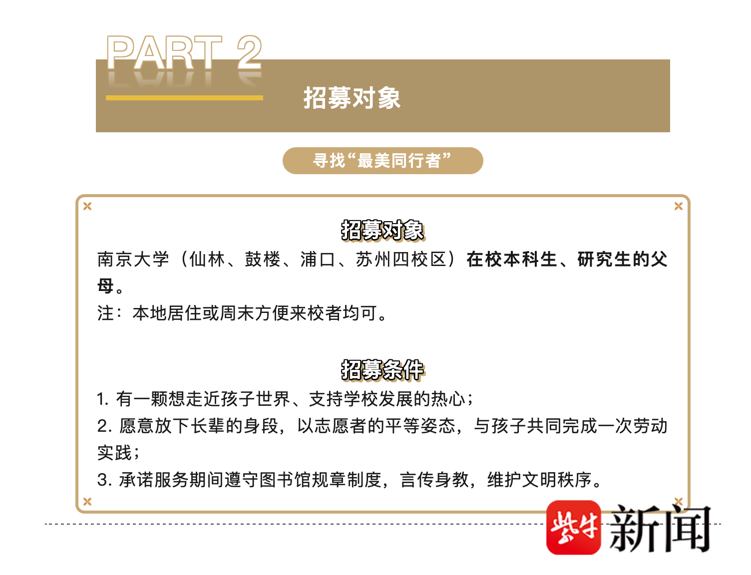 活动面向南京大学仙林、鼓楼、浦口、苏州四校区的在校本科生、研究生父母,本地居住或周末方便来校者均可报名,要求参与者有一颗走近孩子世界的热心,愿意以志愿者平等姿态与孩子共同完成劳动实践,并承诺遵守图书馆规章制度、言传身教维护文明秩序。