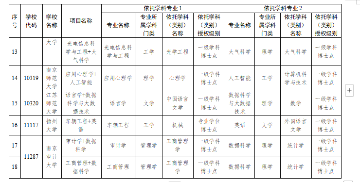 其中,双学士学位复合型人才培养项目有18项,有南京航空航天大学、南京理工大学、中国矿业大学、南京邮电大学、河海大学等多所高校均有培养项目入选。
