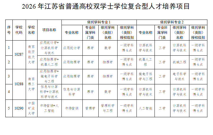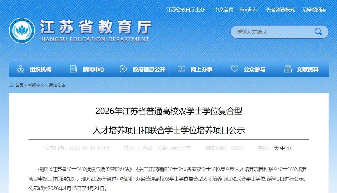 近日,江苏省教育厅公示了2026年江苏省普通高校双学士学位复合型人才培养项目和联合学士学位培养项目,公示期为2026年4月15日至4月21日。