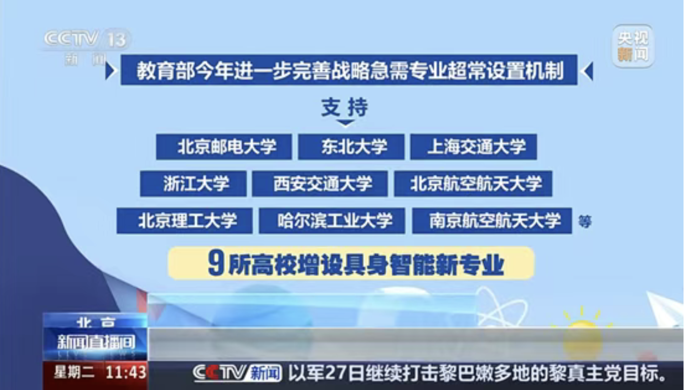 4月28日,教育部发布《普通高等学校本科专业目录(2026年)》,共新增38种本科专业。南京航空航天大学成为全国首批获批增设具身智能专业的9所高校之一,该专业将于2026年起纳入高考招生。