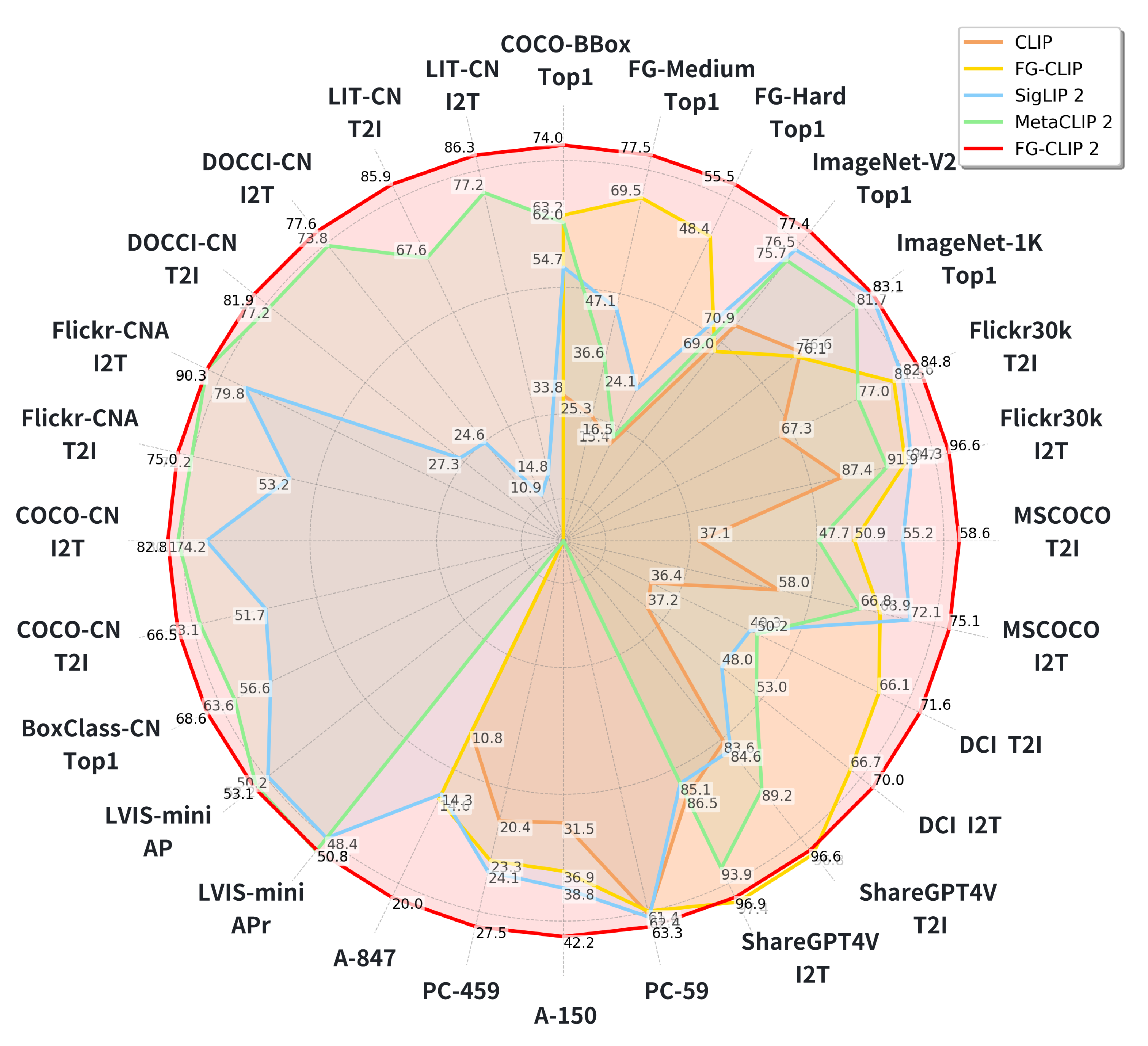 如果说OpenAI在2021年提出的CLIP模型,为AI配上了一副能“看清世界”的普通眼镜;那么FG-CLIP2,则是为AI装备了一台“高精度光学显微镜”,使其能够“洞察入微”。它成功攻克了CLIP模型长期存在的“细粒度识别”痛点。