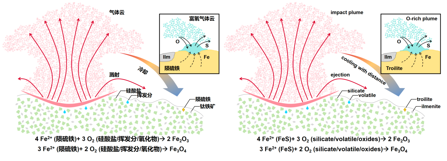 图 3 嫦娥六号样品中发现的铁氧化物成因示意图。图中表示了月球表面物质在大尺度撞击下气化,产生局部的高氧逸度气氛。高温环境使得陨硫铁(FeS)矿物脱硫,并在适当的温度条件(700~1000℃)下被高氧逸度的气氛氧化,形成了赤铁矿(α-Fe2O3)、磁赤铁矿(γ-Fe2O3)和磁铁矿(Fe3O4)。