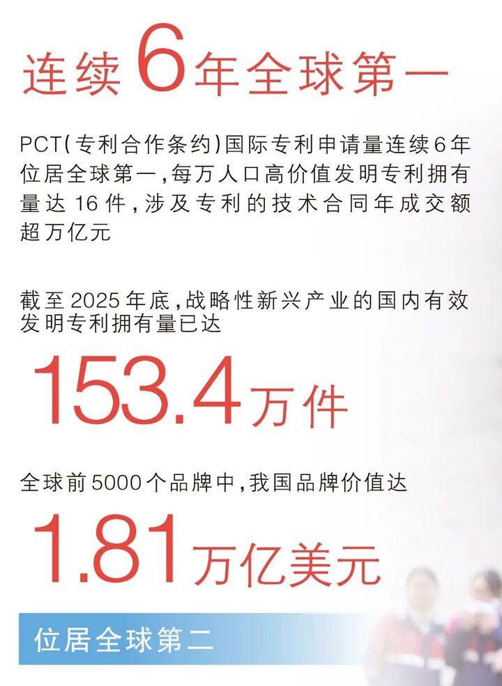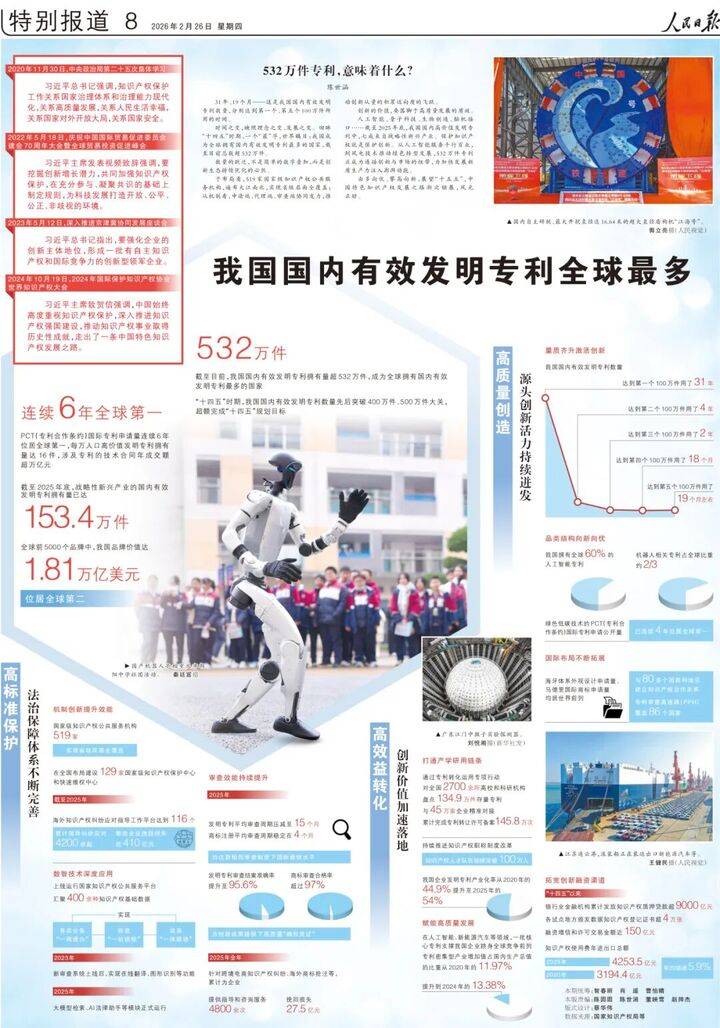 人工智能、量子科技、生物制造、脑机接口……截至2025年底,我国国内高价值发明专利中,七成来自战略性新兴产业。保护知识产权就是保护创新。从人工智能服务千行百业,到风电技术推动绿色转型发展,532万件专利正成为连接创新与市场的纽带,为加快发展新质生产力注入澎湃动能。