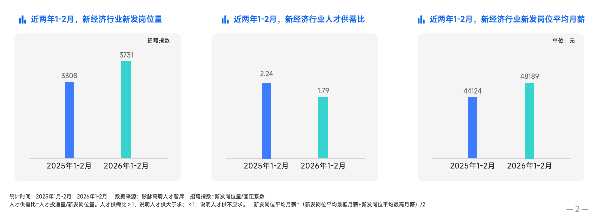 《洞察》显示,2026年1-2月,新经济行业新发岗位量同比增长12.77%,招聘需求明显回温。与此同时,人才供需比从2025年同期的2.24下降至1.79,即从“约2.24人竞争1个岗位”下降至“约1.79人竞争1个岗位”,求职竞争压力有所缓解。