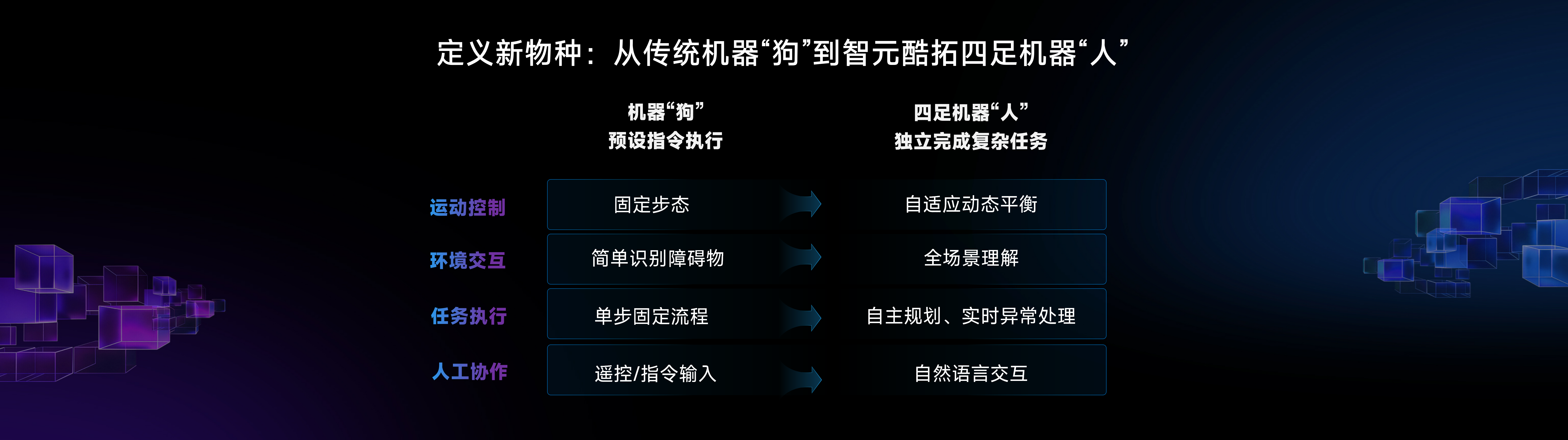 依托智元集团的全栈核心技术能力,智元酷拓四足机器人将实现从执行机器到智能主体的跨越。传统机器狗依赖预设指令、固定步态、人工遥控;智元酷拓四足机器“人”具备自适应动态平衡、全场景环境理解、自主任务规划、实时异常处理与自然语言交互能力,可独立完成复杂作业。