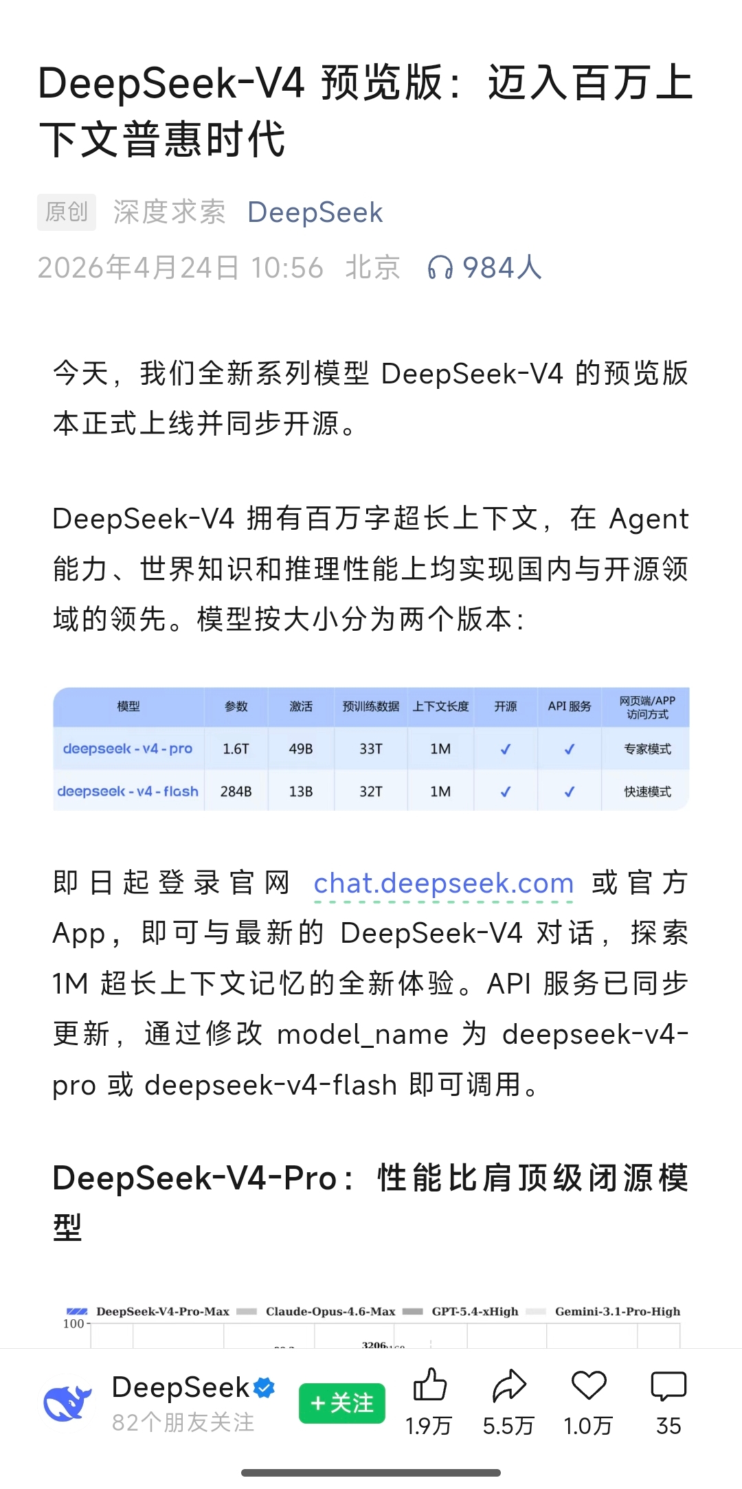 DeepSeek-V4 Preview发布当天引发热议,被视为“中国 AI的又一里程碑”,尤其在开源生态、编程能力和长上下文方面威胁最大。