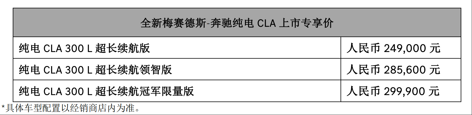 11 月 5 日,全新梅赛德斯-奔驰纯电 CLA 正式上市,提供纯电 CLA 300 L 超长续航版、纯电 CLA 300 L 超长续航领智版、纯电 CLA 300 L 超长续航冠军限量版 (100 台限量发售)等 3 款车型选择,全国统一的上市专享价分别为人民币 24.9万元至 29.99万元。
