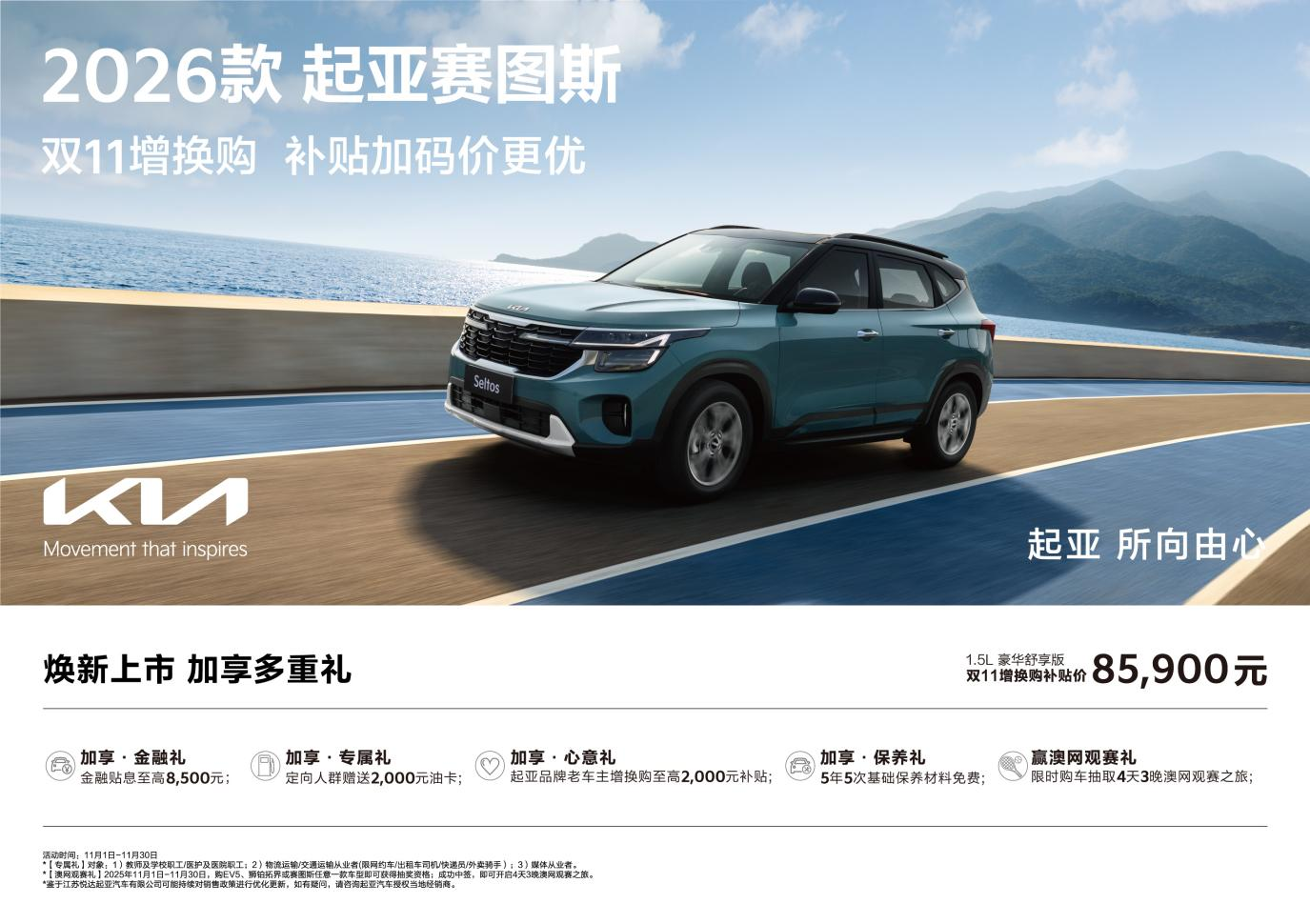 具体来看,在11月1日-11月30日期间,消费者购买2026款起亚赛图斯可享双11增换购补贴价权益,以官方指导价129,900元的1.5L豪华舒享版为例,双11增换购补贴价仅需85,900元,消费者购车另享至高8,500元金融贴息、定向人群赠送2,000元油卡、起亚品牌老车主增换购至高2,000元补贴、5年5次基础保养材料免费等专享权益。更值得期待的是,购车的用户还能参与抽奖活动,有机会赢取4天3晚的澳网之旅,亲临2026年澳网现场,见证快乐大满贯的无限魅力。