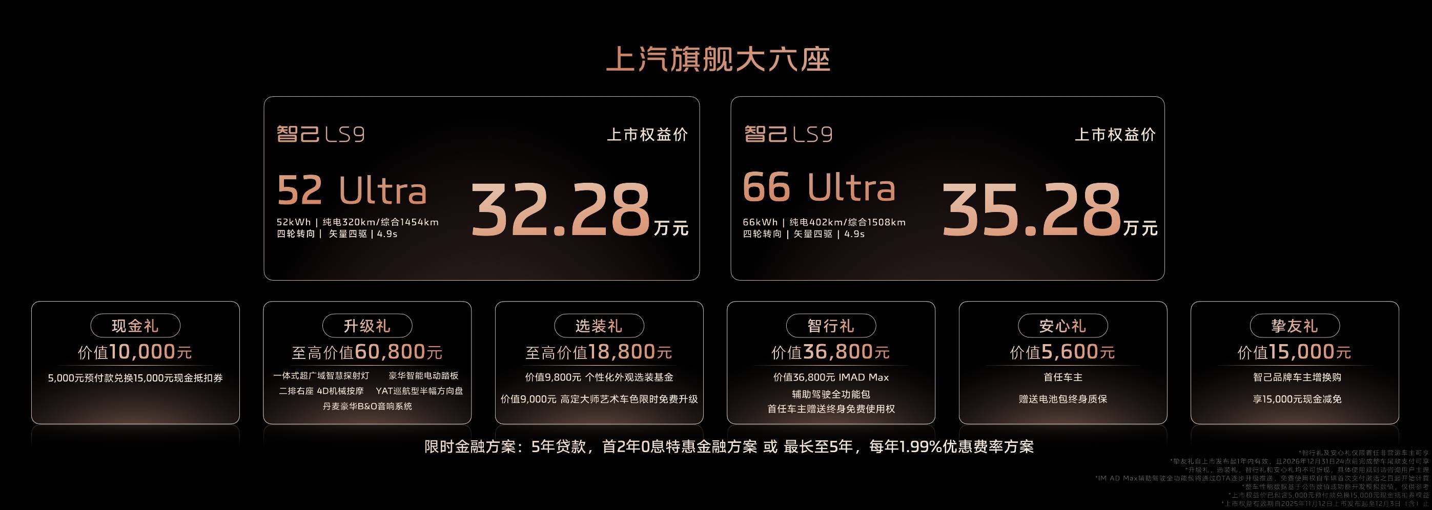 更震撼的是,智己LS9上市权益诚意爆棚,将奢华B&O音响系统、二排右侧4D机械按摩、一体式超广域智慧探射灯、豪华智能电动踏板等旗舰豪华配置,统统限时免费升级!新车震撼发布两个超级增程版本:智己LS9 52 Ultra版上市权益价32.28万元,入门即巅峰,以30万出头的价格,享受时代最旗舰的满配大六座;智己LS9 66 Ultra版,更搭载66度宁德时代超级骁遥MAX电池,将续航和性能推向极致,上市权益价35.28万元,一锤定音30万级最强旗舰爆品。