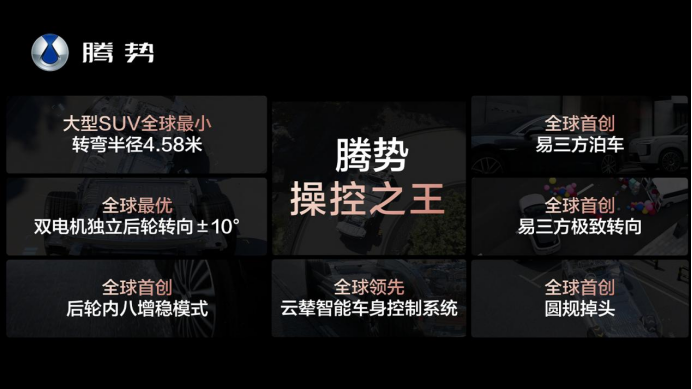 极致安全之外,腾势N8L的操控同样出色,堪称新能源时代的操控之王。其全系标配“插混专用2.0T高效发动机+三电机”的强大动力系统,零百加速仅需3.9秒。全球最优的后轮双电机独立转向技术更是带来4.58米同级最小转弯半径,让这台5.2米的大家伙拥有超越A0级小车的灵活性。配合35.4米的优异刹车距离和云辇-A智能空气车身控制系统,腾势N8L将豪华、安全与驾控完美融合。