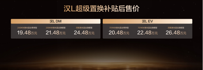 此次,汉L EV 3款车型,超级置换补贴后售价20.48万—26.48万元;汉L DM 3款车型,超级置换补贴后售价19.48万—24.48万元;唐L EV 3款车型,超级置换补贴后售价22.48万~27.48万元;唐L DM 3款车型,超级置换补贴后售价21.48万—27.08万元。同时,比亚迪还为用户准备了包含置换补贴在内的至高价值5.2万元(汉L)/4.5万元(唐L)尊享礼遇。(以上权益截至12月31日)