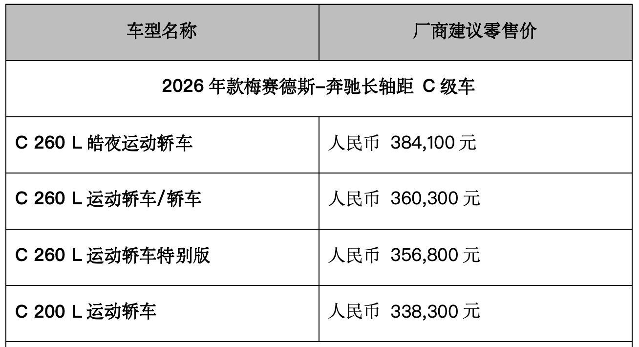 本次,长轴距C级车以价值4.5万元的诚意升级,回应客户的信任与支持。动力方面全面进阶,全系搭载M254 2.0T发动机,动力响应灵敏、加速平顺、动力储备充足、噪音低,进一步提升驾驶者的操控自信。全系标配可加热前排座椅及带360°摄像头的智能泊车,在冬季出行与城市复杂车位中带来更贴心、更便捷的体验。此外,C 260 L运动轿车及轿车、C 260 L皓夜运动轿车标配导航辅助驾驶(覆盖全国范围高速路段与城市快速路段)、无钥匙进入舒适组件、智能手机数字钥匙、Burmester® 3D环绕立体声音响系统等配置,让出行从进入车辆的一刻起就充满豪华仪式感。家族新增C 260 L运动轿车特别版,标配带记忆功能的可电动调节驾驶员座椅、前排空调座椅及嵌铝质饰条的黑色开孔型木饰,为更专注个人体验的客户提供更精准的选择。