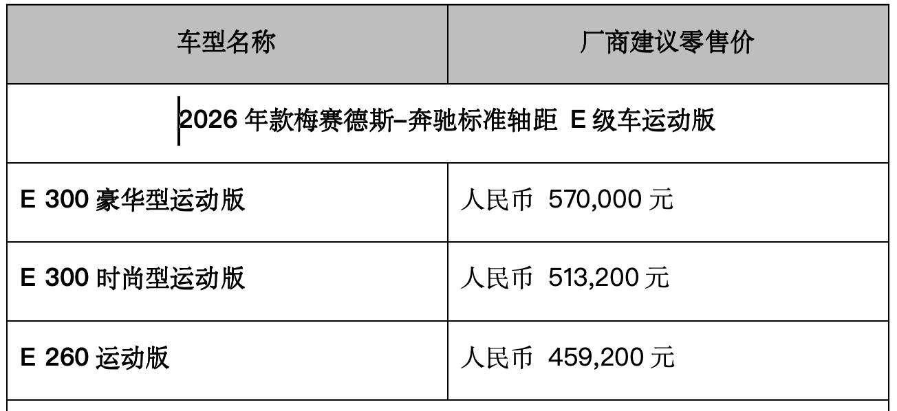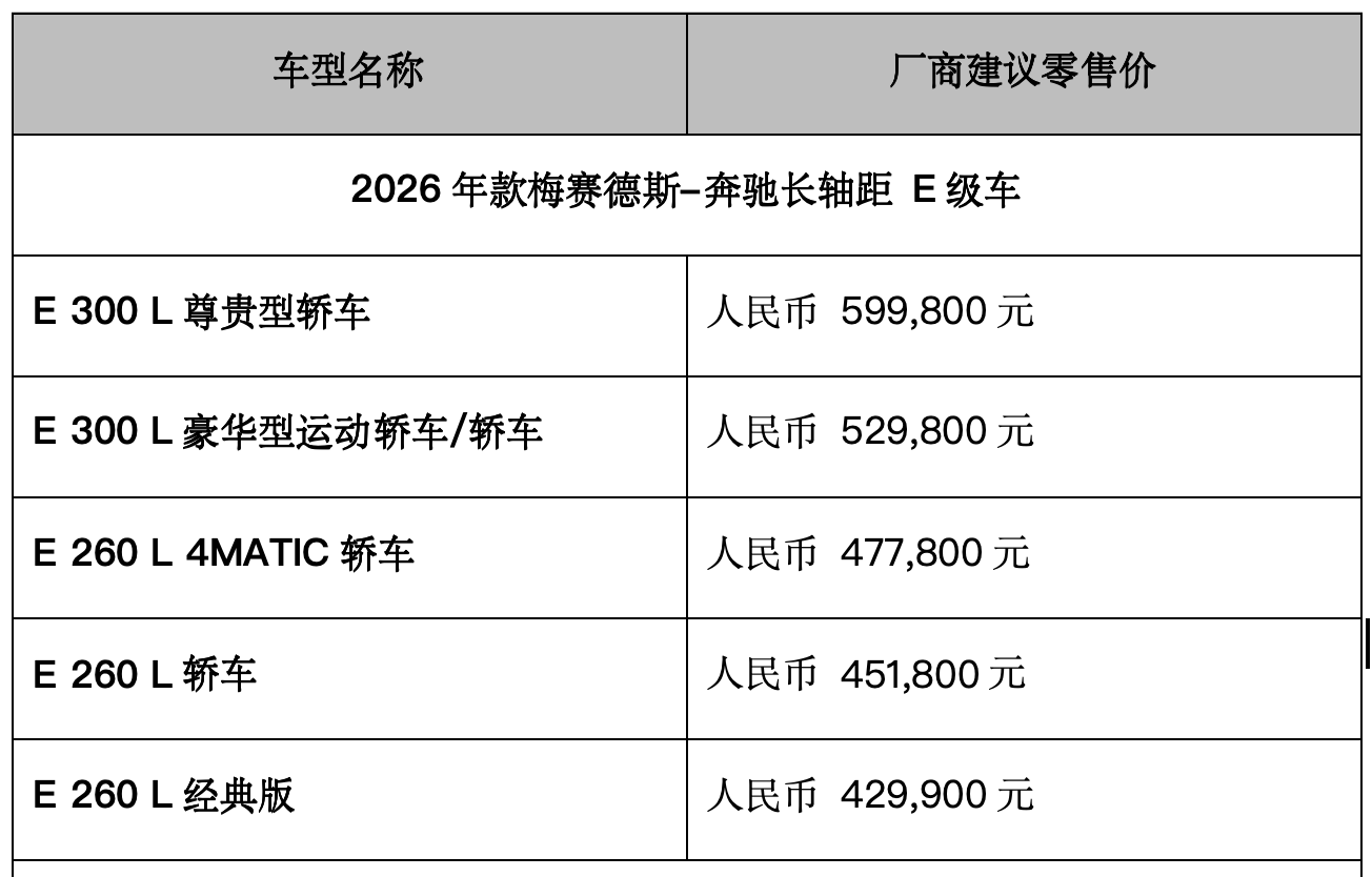 本次焕新,E级车家族产品实力全面进阶。长轴距E级车序列新增E 260 L经典版,延续原E 260 L车型经典配置的基础上,以差异化产品配置满足客户需求。全系迎来智能及舒适升级,E 260 L轿车及以上车型新增标配导航辅助驾驶(覆盖全国范围高速路段与城市快速路段)、可加热前排座椅和自动防眩目后视镜,让日常通勤更轻松、夜间驾车更从容。E 300 L豪华型及以上车型新增标配前后排座椅加热和通风,为四季出行提供舒适驾乘体验。