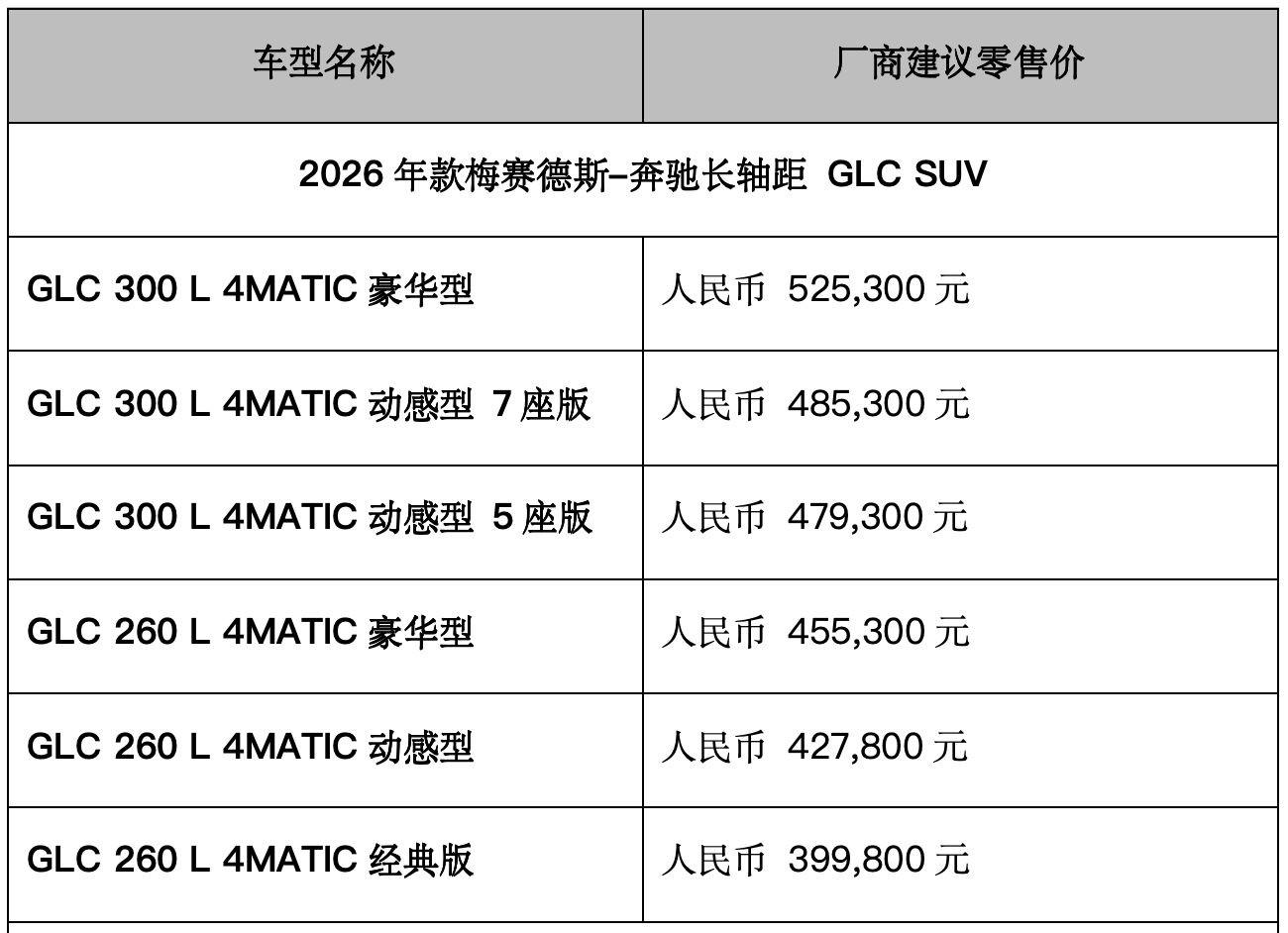 长轴距GLC SUV新增GLC 260 L 4MATIC经典版,进一步丰富客户选择。GLC 260 L 4MATIC动感型及以上车型标配导航辅助驾驶(覆盖全国范围高速路段与城市快速路段)、可加热前排座椅,无论冬季早高峰还是高速长距离行驶,都能舒适从容。GLC 260 L 4MATIC豪华型及以上车型标配智能手机数字钥匙,GLC 300 L车型标配Burmester® 3D环绕立体声音响系统,每一次启程都更具豪华仪式感。