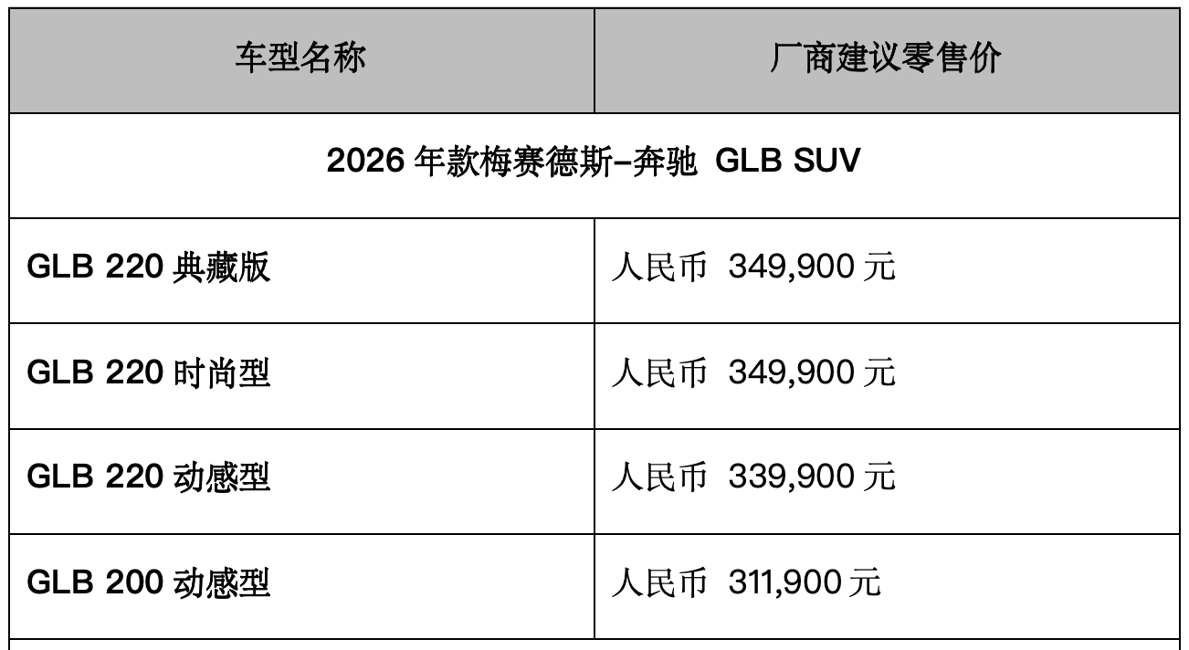 梅赛德斯-奔驰SUV家族同样迎来焕新升级。GLB SUV推出GLB 220典藏版,标配MANUFAKTUR哑光山灰色车漆、夜色组件、19英寸AMG轮毂,外观更具运动气质;标配前排无线充电功能和带360°摄像头的智能泊车,兼具精致格调和日常实用性。GLB SUV全系新增标配智能领航辅助Plus、可加热前排座椅、环境氛围照明系统,让冬季出行轻松暖心。GLB 220车型新增标配Burmester®环绕立体声音响系统、无钥匙进入舒适组件、前排座椅电动调节,让更多客户享受到殿堂级听觉盛宴和轻松舒适的出行体验。