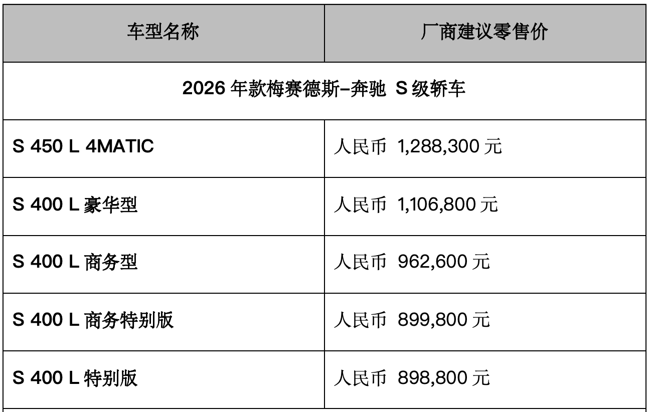 本次产品升级,S级轿车全系标配导航辅助驾驶(覆盖全国范围高速路段与城市快速路段)、空气悬挂系统、电吸门,让客户从启程到行驶的每一步,都能尽享从容。新增S 400 L商务特别版,为更多客户提供豪华旗舰的新选择。S 400 L商务型及以上车型标配主动式环境氛围灯、Burmester® 3D环绕立体声音响系统,从视觉到听觉,感官之享全面进阶。