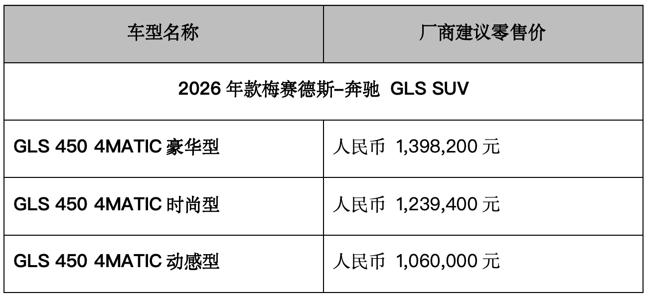 本次升级中,GLS SUV全系标配智能领航辅助Pro,GLS 450 4MATIC时尚型及以上车型新增标配多仿形前排座椅、甄选真皮座椅、电吸门,让落座更具仪式感的同时进一步提升长途乘坐舒适性。作为奔驰SUV家族中的旗舰车型,GLS SUV基于大型SUV专属平台MHA平台打造,在公路行驶的稳重舒适和强大越野性能之间取得平衡;实用的智能辅助驾驶更能帮助客户在高速驾驶中缓解疲劳,展现大型豪华SUV的从容气度。