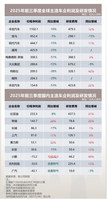 中外车企业绩“冰火两重天”背后,中国车企在智电转型中持续研发投入所形成的技术先发优势,是其实现阶段性突围的关键助推器之一。各家主流车企的三季报显示,国内头部大厂前三季度研发费用的涨幅普遍高于国际巨头,大多保持两位数增长,其中比亚迪投入达437亿元,同比增长31%。而海外车企受制于全球业绩压力,整体增速明显放缓,大众、宝马出现9%和15%的下滑。