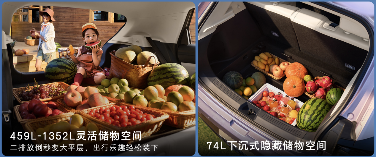 小身材有大格局,极狐T1以4337mm车长、1860mm车宽、2770mm轴距,刷新A0级空间标准。二排膝部空间102mm、肘部1508mm, 1.85米乘客坐后排也能轻松跷腿。全车32处储物格 + 459L同级最大后备厢,后排放倒后容积高达1352L,露营装备、婴儿车、滑雪板统统装得下。下沉式后备厢还额外提供74L隐藏空间,干湿分离、防刮防碎,细节处处为家庭用户着想。