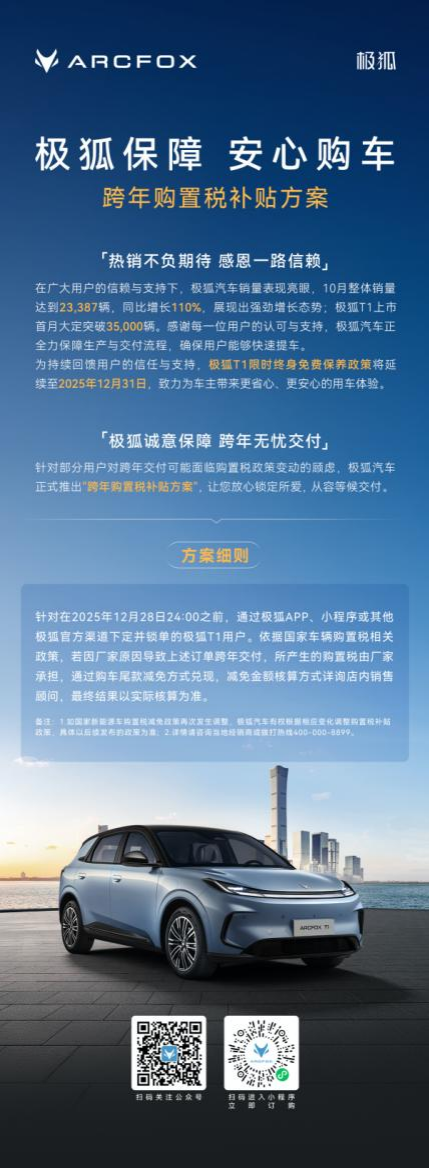凡在2025年12月28日24:00前通过极狐APP、小程序或官方渠道下定并锁单的用户,若因厂家原因导致订单跨年交付,所产生的车辆购置税将由厂家全额承担,直接抵扣购车尾款,让用户安心锁定心仪车型。