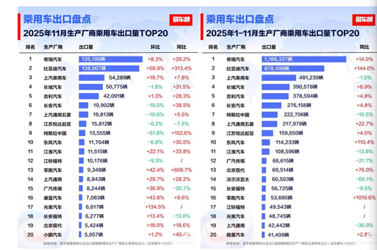 据易车数据显示,2025年11月,比亚迪乘用车出口量达到12.8万台,同比增长313.4%;今年1-11月累计出口87.8万台,同比增长144%,较2024全年总出口量已实现翻倍式增长,比亚迪成为中国出口增速最快的车企之一。