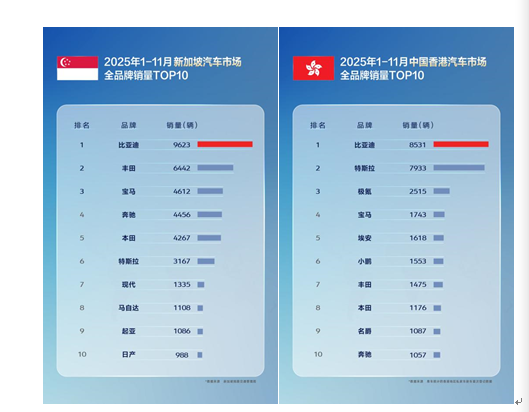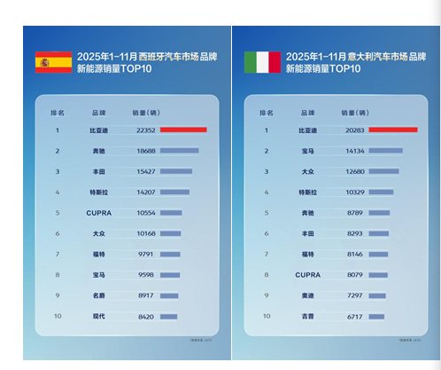 2025年1-11月,比亚迪在英国、德国、意大利、西班牙、奥地利、爱尔兰、马来西亚、土耳其、新加坡、泰国、中国等11个汽车核心国家市场,销量已经全面超越特斯拉。凭借多元化产品矩阵,比亚迪精准契合了全球不同市场消费者的差异化需求。同时,通过推进自建滚装船、本地化生产、构建完善的服务体系等一系列协同举措,为其海外拓展提供了坚实支撑。在这些出海策略的有力推动下,比亚迪出海狂飙全球领跑。