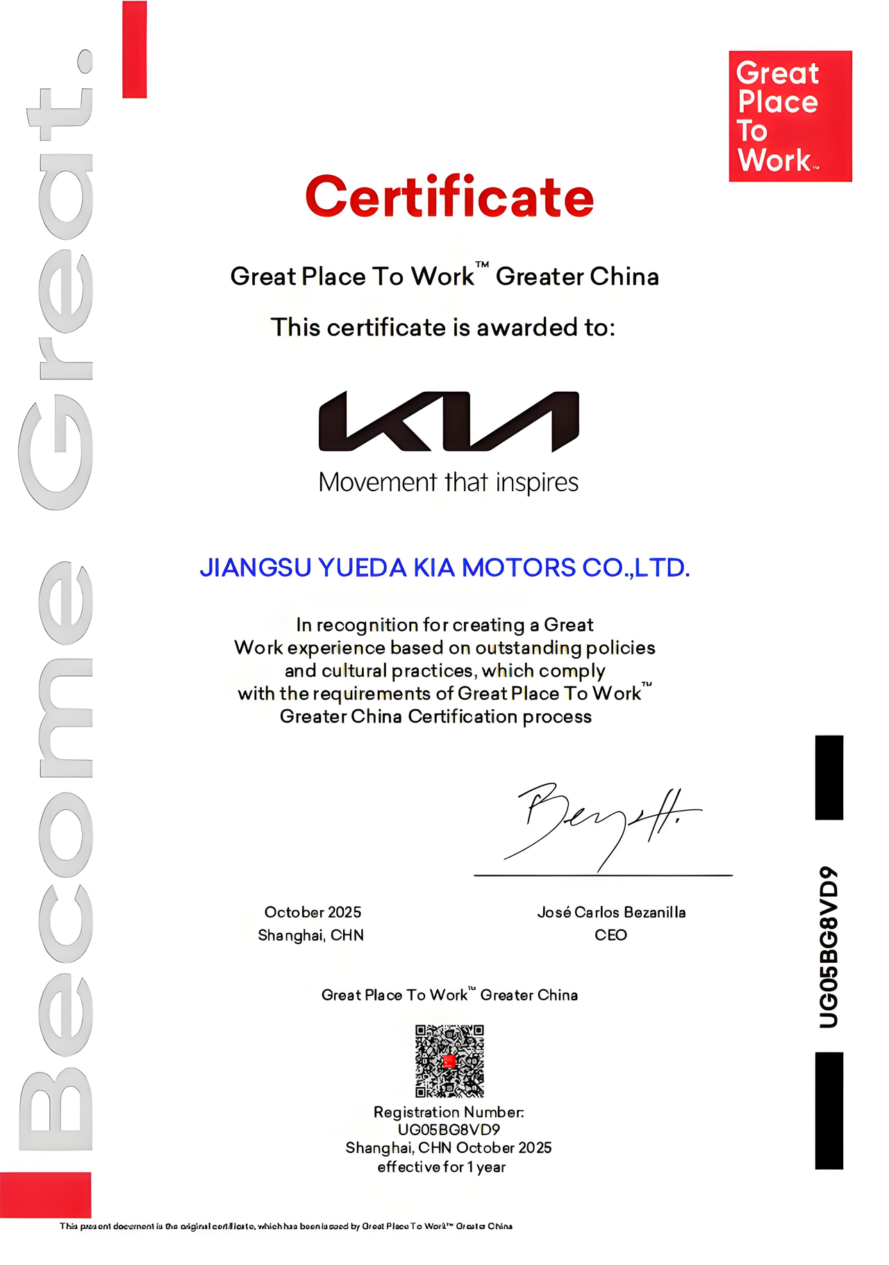 值得关注的是,在行业极度内卷的背景下,悦达起亚积极推进组织文化变革,构建了企业与员工和谐共生、双向赋能的职场生态,深入践行“以人为本”的长期主义发展理念。凭借在职场文化、人才梯队、员工关怀等领域的卓越实践,悦达起亚以93%的员工信任指数,高分荣获全球权威职场文化评估机构——Great Place To Work® (卓越职场研究所)颁发的“卓越职场”认证,成为2025年中国汽车行业唯一获得此项殊荣的汽车企业。