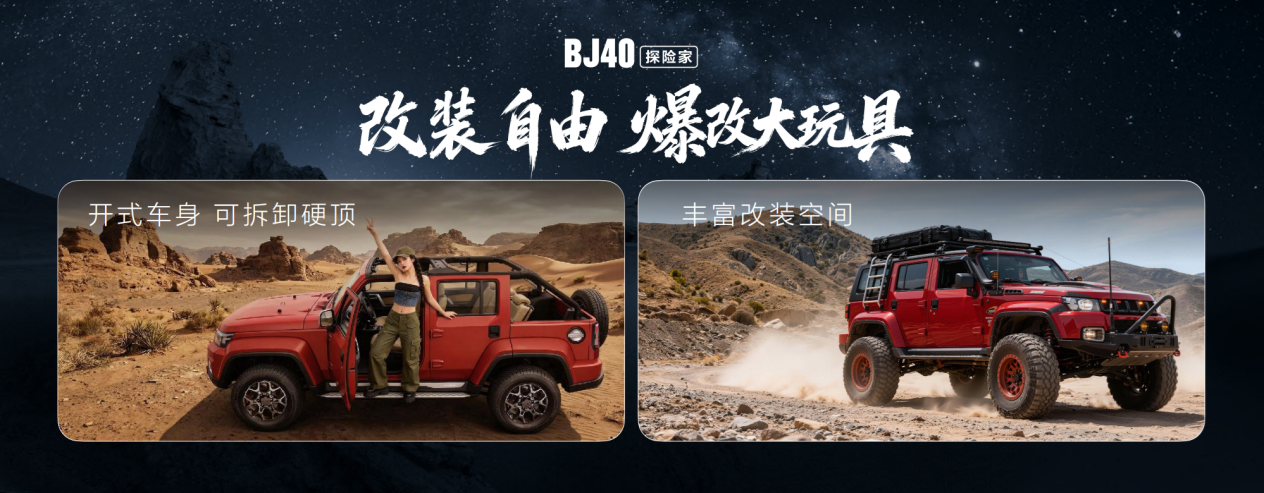 BJ40探险家是一个“爆改大玩具”,采用同级唯一快拆硬顶设计和开式车身,硬派越野可变身敞篷越野车;支持深度创意,是一个容纳千种玩法、万般想象的潮流生活伙伴。