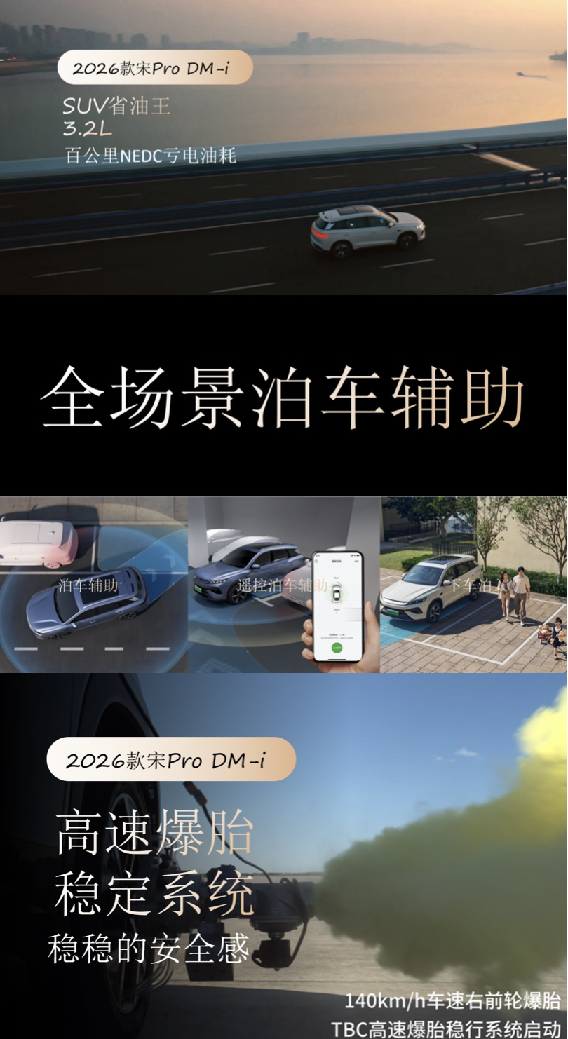 2026款宋Pro DM-i 家用插混SUV引领者,2026款宋Pro DM-i 长续航版搭载更大容量的刀片电池,CLTC纯电续航提升至220公里,日常通勤可实现零油耗,极大降低用车成本。即便延长通勤距离,也能保持低频充电。智能体验优化,配合好孩子智能儿童安全座椅、倍轻松按摩设备等,为旅途增添舒适与便利。全车支持OTA远程升级,确保智能配置始终更新。天神之眼辅助驾驶系统及高速爆胎稳定控制系统,提供全方位的安全保障,确保家庭出行的每一刻都安心无忧。![]()