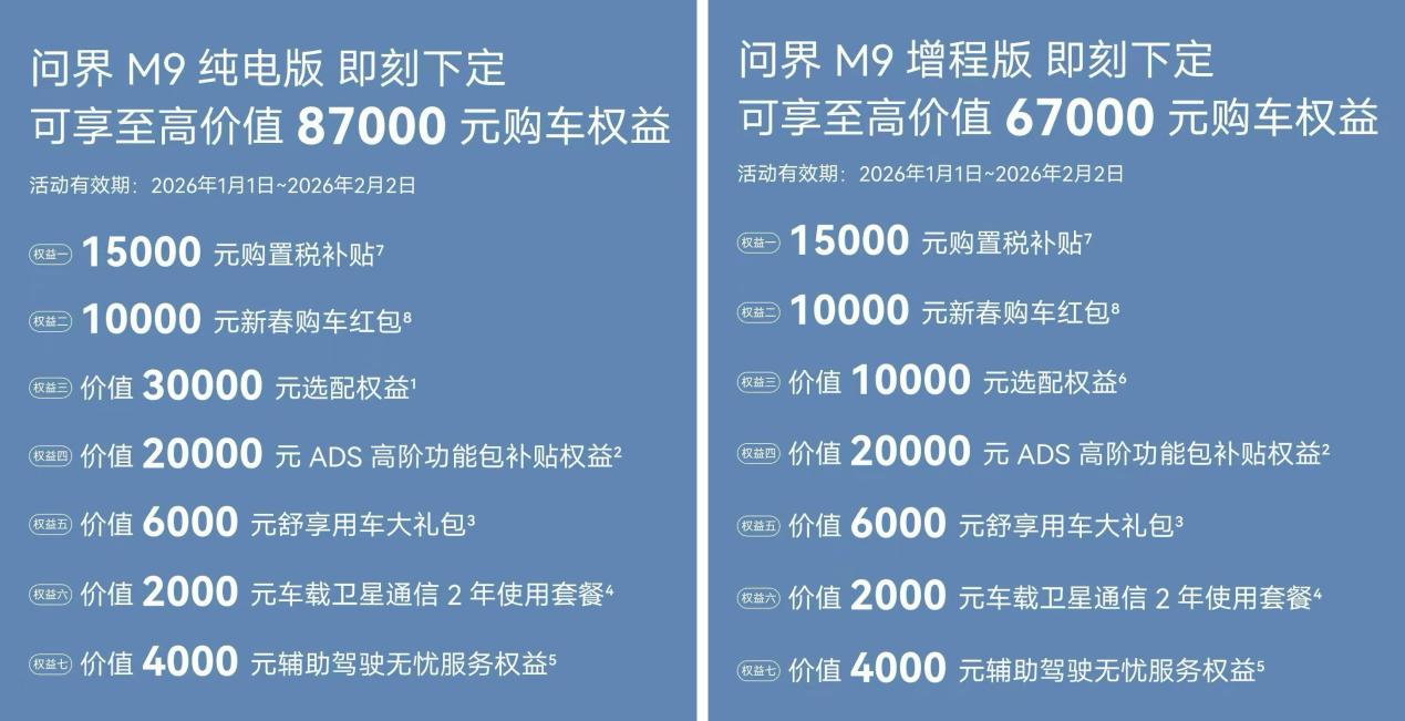 此次优惠政策表明:即日起至2月2日,下定问界M9至高可享87000元购车权益,包含购置税补贴、购车红包及ADS高阶功能包补贴等多重礼遇。这不仅是真金白银的购车优惠,更是对用户选择智慧豪华出行方式的实质性回馈,让科技豪华体验真实可感、触手可及。