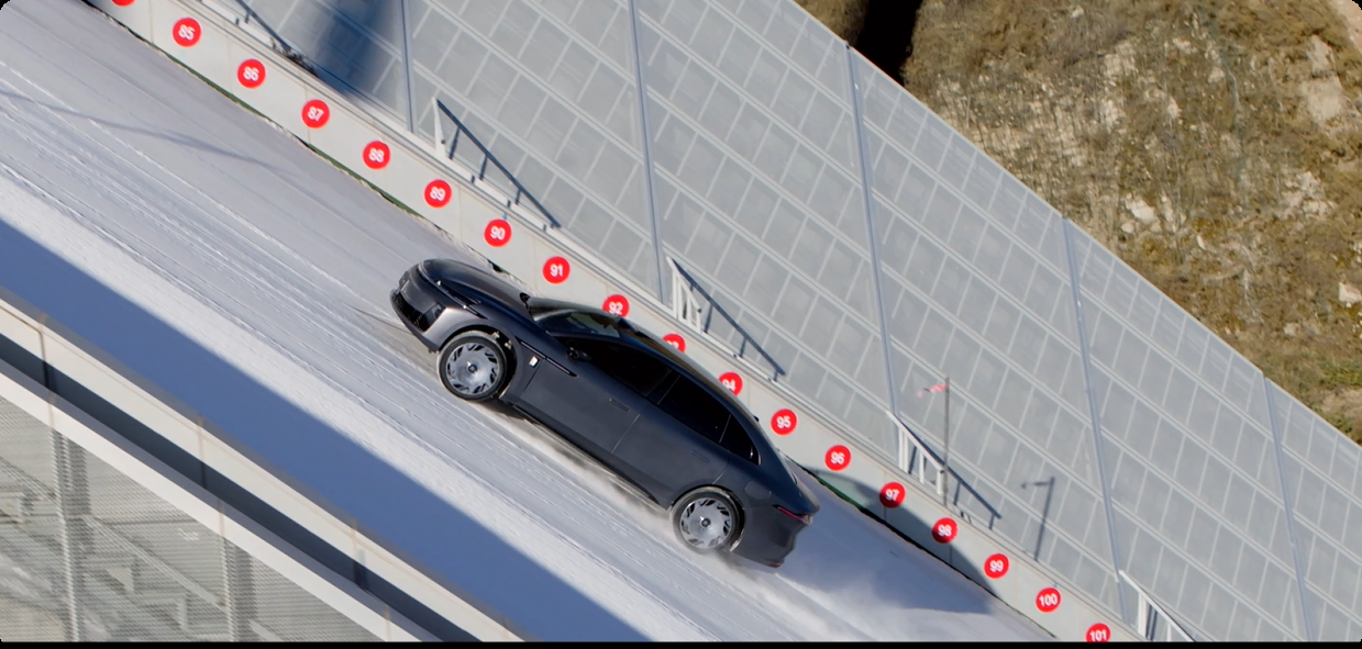 发布会前,昊铂A800凭借这套底盘系统的加持,顺利登顶国家跳台滑雪中心“雪如意”,面对85米垂直落差、125米坡长、37.1度最大坡度,克服冰雪湿滑、陡坡等多重极端条件,完成了行业第一个双人冲坡挑战,实现对经典豪华极限爬坡能力的正面超越。