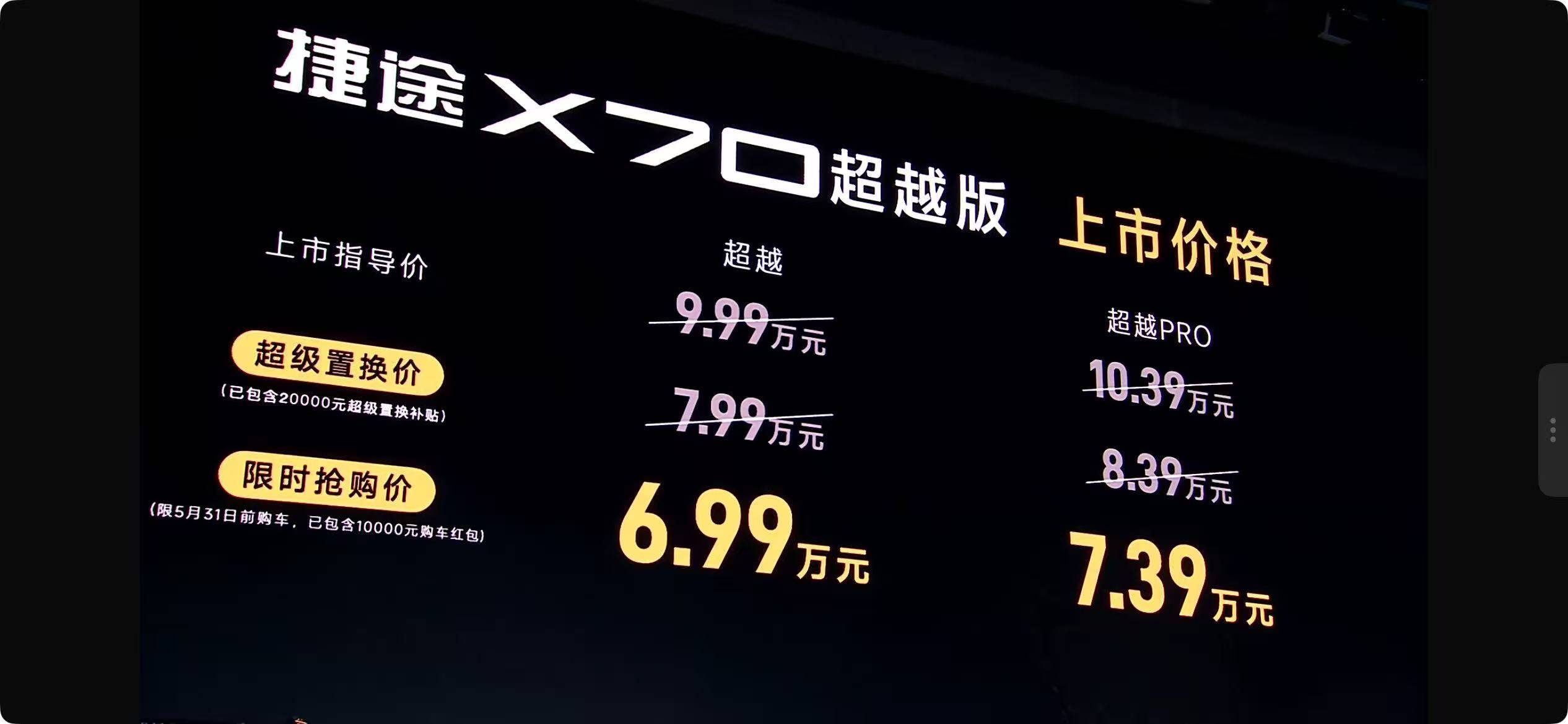 在燃油车市场,X70超越版同样以“宽体大七座”的空间实力,诠释了“旅行小房车”的真谛。4749mm车长、1900mm车宽及2745mm轴距,塑造了媲美豪华商务舱的1500mm内部横向空间。其5/7座灵活布局与31处全域储物空间,让每一次家庭出行都井井有条。36分贝图书馆级静谧座舱与二排25°-41°可调座椅,则让这个“移动的家”在宽适之外,更添一份静谧与惬意。新车推出2款车型,官方指导价9.99万-10.39万元,限时抢购价6.99万-7.39万元,附3重购车豪礼,堪称7万级燃油SUV“空间价值卷王”。