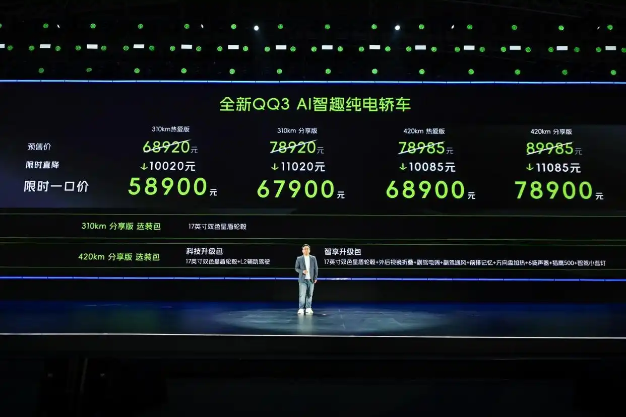 全新QQ3携310km、420km两种续航版本,共推出4款车型,限时一口价售价区间为5.89万元至7.89万元。与价格同步公布的,还有针对首批车主打造的“一部到位礼”权益包,全面覆盖金融、用车、服务三大维度,让用户购车无忧、用车安心。全新QQ3以5.89万的起售价,精准契合年轻人第一台车的心理预算,更在核心产品力上实现突破——2700mm超长轴距、82%高强度钢+16%热成型钢的安全车身、高通8155芯片+Carmind大模型的智能化配置,形成了鲜明的产品优势。这并非单纯的价格竞争,而是奇瑞以高配低价的诚意,打响价值战,致力于重新定义A0级小车的品价比天花板,为用户带来更高价值的出行体验。