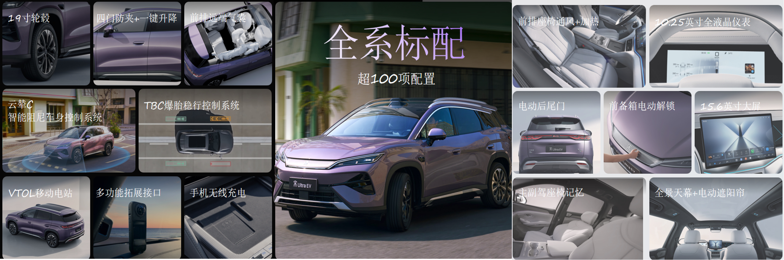 配置方面,宋Ultra EV真正做到“起步即满配”。全系标配第二代刀片电池、800V闪充技术、云辇-C智能阻尼车身控制系统、TBC高速爆胎稳行系统。其中,云辇-C系统可实现毫秒级无级自适应调节,搭配前双球头麦弗逊、后五连杆独立悬架,在高速过弯等场景下带来稳定精准的操控体验;TBC高速爆胎稳行系统在最高140km/h时速下爆胎瞬间介入,稳住车辆,为全家出行提供坚实安全保障。此外,全车配备7个安全气囊,包含同级少有的前排远端安全气囊,车身以高达77%的超高强度钢打造。