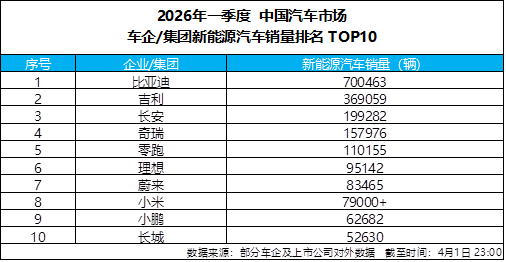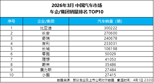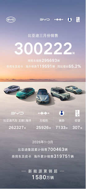 4 月 1 日,比亚迪发布 2026 年 3 月产销数据,单月总销量达300222 辆,强势突破 30 万辆大关,斩获中国车企销量冠军,并连续 58 个月蝉联中国新能源汽车销量冠军,持续稳固行业龙头地位。截至目前,比亚迪新能源汽车累计销量已超1580 万辆,一季度累计销售 700463 辆,以硬核数据印证技术与规模双重实力,助力一季度完美收官。