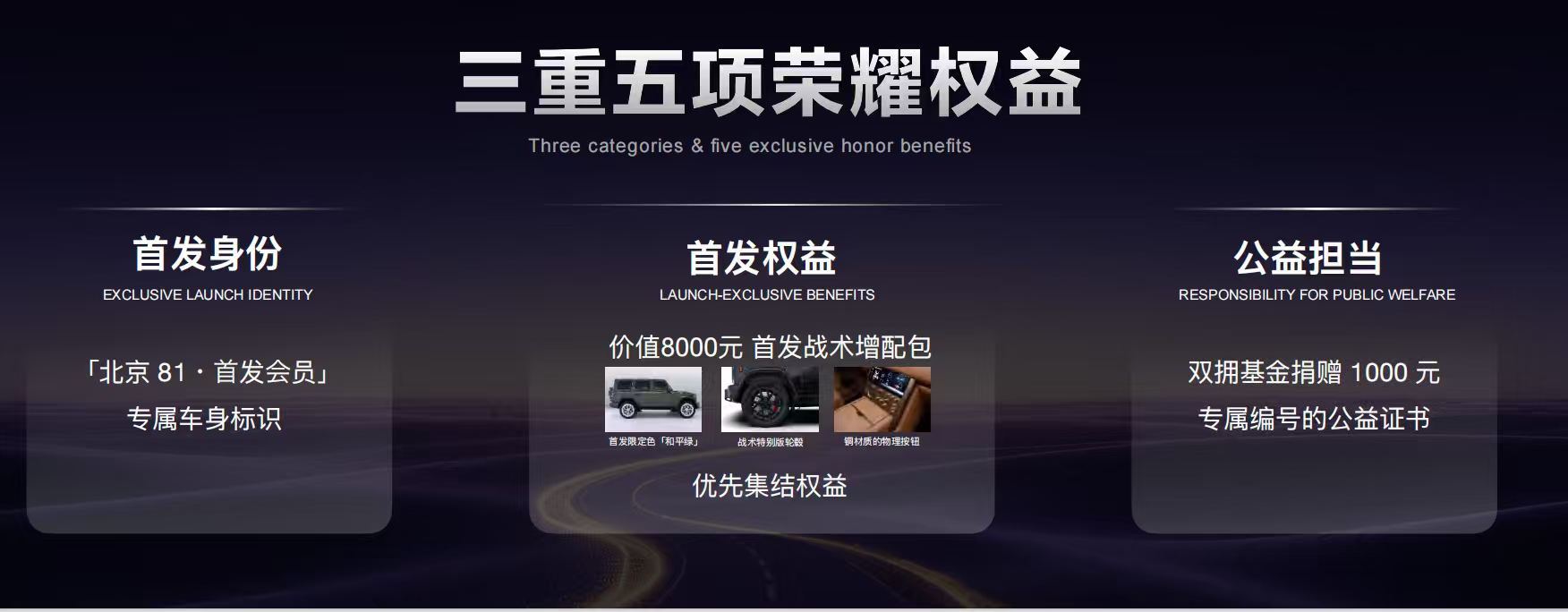 盲订且最终购车的用户,将获授「北京 81・首发会员」荣誉身份,并授予线上勋章和实体徽章。首发车型将在车身多处,镌刻首发车印记,打造专属身份标识。