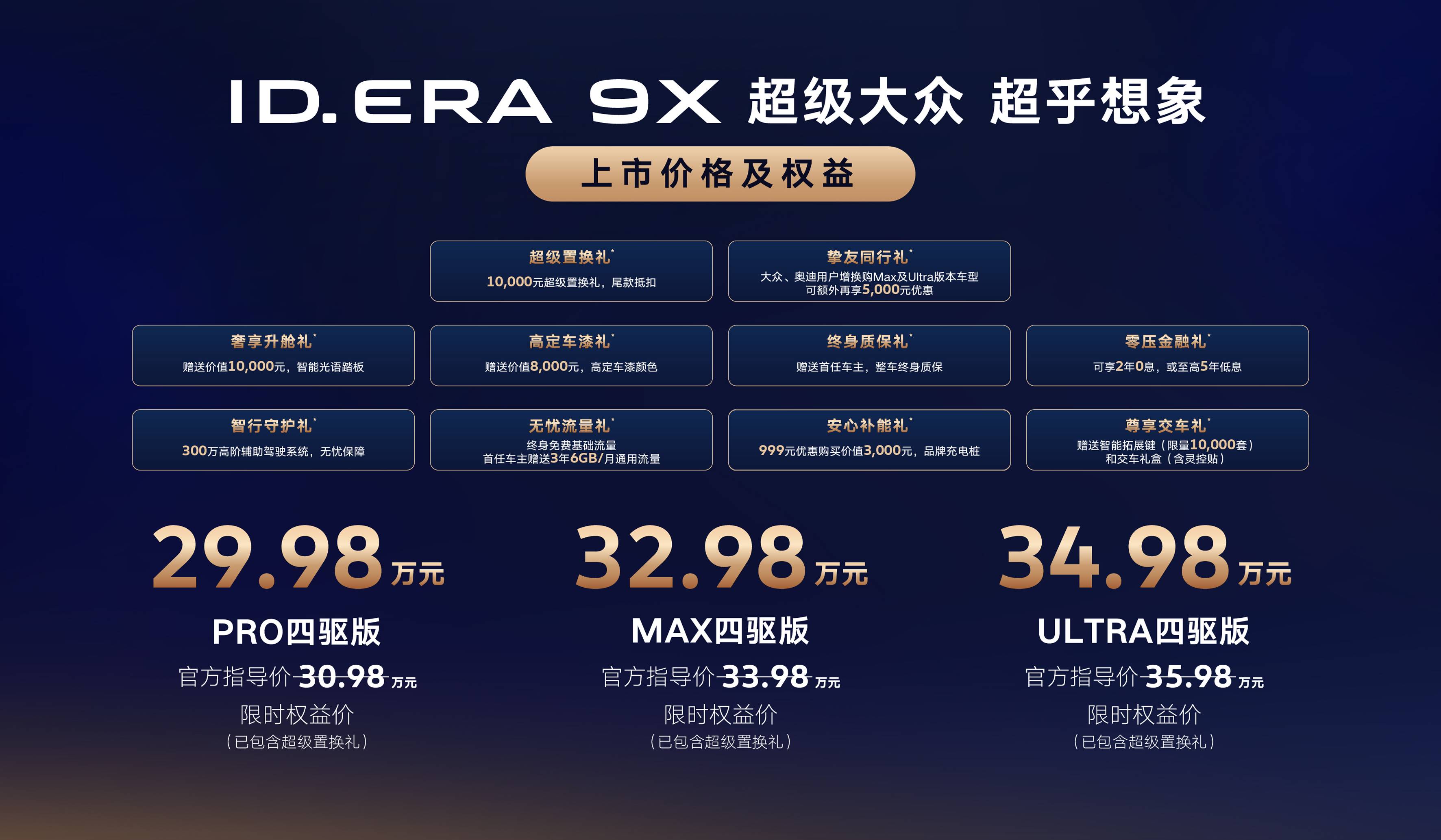 ID. ERA 9X共推出三款四驱版车型,官方指导价区间为30.98万至35.98万元。至5月31日至,上汽大众还给出一个29.98万元至34.98万元的限时权益价。更绝的是,三款车型全系标配EA211 1.5T EVO II黄金增程器、高功率双电机、主动后轮转向系统、行云智能辅助驾驶架构以及那块极具科幻感的SmartSurface魔术屏。